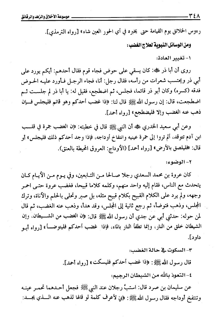 وعن أبي سعيد الخدري - رضي الله عنه - أن النبي - صلى الله عليه وسلم - قال في خطبته: "إن الغضب جمرة في قلب ابن آدم تتوقد، ألم تروا إلى حمرة عينيه وانتفاخ أوداجه، فإذا وجد أحدكم ذلك فليجلس" أو قال: "فليلصق بالأرض" [رواه أحمد] (الأوداج: العروق المحيطة بالعنق).