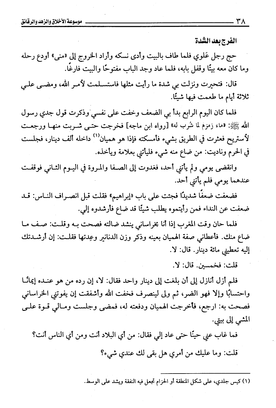 فلما كان اليوم الرابع بدأ بي الضعف وخفت على نفسي وذكرت قول جدي رسول الله - صلى الله عليه وسلم -: "ماء زمزم لما شُرب له" [رواه ابن ماجه] فخرجت حتى شربت منها ورجعت لأستريح فعثرت في الطريق بشيء فأمسكته فإذا هو هميان (¬1) داخله ألف دينار، فجلست في الحرم وناديت: من ضاع منه شيء فليأتني بعلامة ويأخذه.