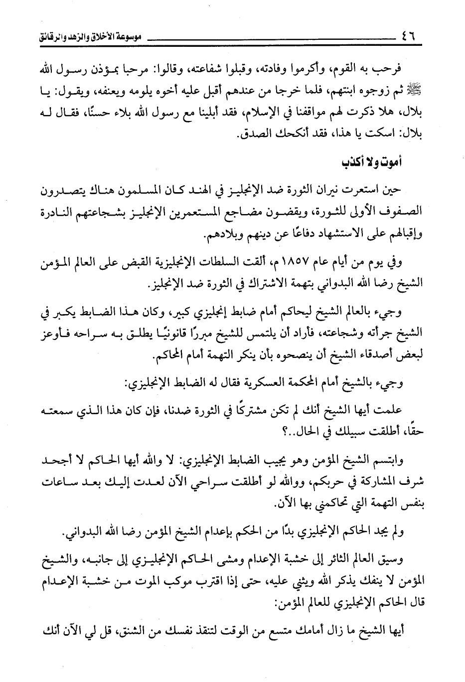 وسيق العالم الثائر إلى خشبة الإعدام ومشى الحاكم الإنجليزي إلى جانبه، والشيخ المؤمن لا ينفك يذكر الله ويثني عليه، حتى إذا اقترب موكب الموت من خشبة الإعدام قال الحاكم الإنجليزي للعالم المؤمن: