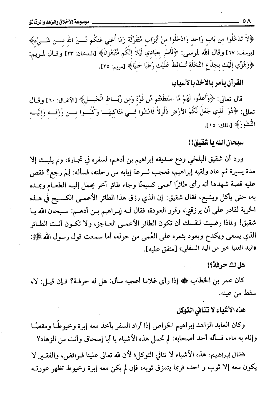 ورد أن شقيق البلخي ودع صديقه إبراهيم بن أدهم، لسفره في تجارة، ولم يلبث إلا مدة يسيرة ثم عاد ولقيه إبراهيم، فعجب لسرعة إيابه من رحلته، فسأله: لِمَ رجع؟ فقص عليه قصة شهدها أنه رأى طائرًا أعمى كسيحًا وجاء طائر آخر يحمل إليه الطعام ويمده به، حتى يأكل ويشبع، فقال شقيق: إن الذي رزق هذا الطائر الأعمى الكسيح في هذه الخربة لقادر على أن يرزقني، وقرر العودة، فقال له إبراهيم بن أدهم: سبحان الله يا شقيق! ولماذا رضيت لنفسك أن تكون الطائر الأعمى العاجز، ولا تكون أنت الطائر الذي يسعى ويكدح ويعود بثمره على العُمى من حوله، أما سمعت قول رسول الله - صلى الله عليه وسلم -: "اليد العليا خير من اليد السفلى" [متفق عليه].