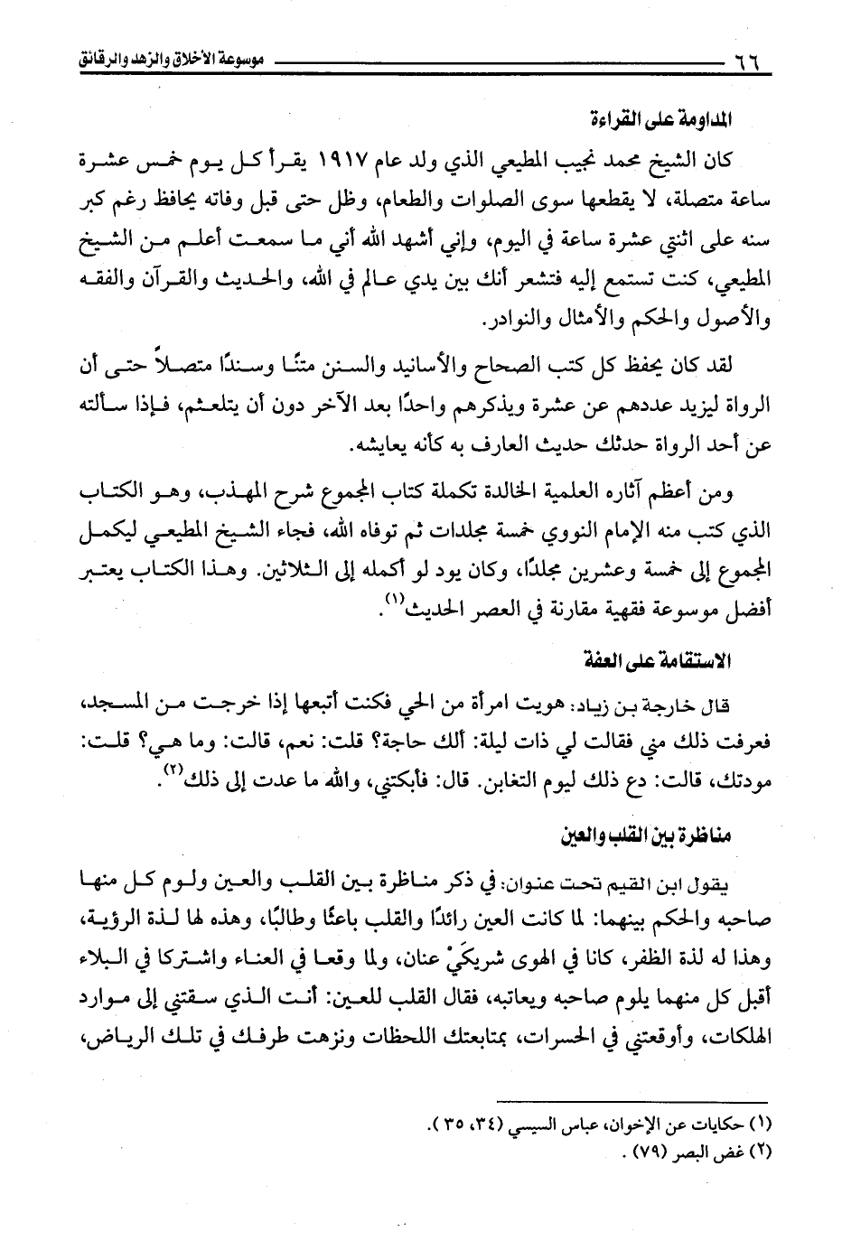 كان الشيخ محمد نجيب المطيعي الذي ولد عام 1917 يقرأ كل يوم خمس عشرة ساعة متصلة، لا يقطعها سوى الصلوات والطعام، وظل حتى قبل وفاته يحافظ رغم كبر سنه على اثنتي عشرة ساعة في اليوم، وإني أشهد الله أني ما سمعت أعلم من الشيخ المطيعي، كنت تستمع إليه فتشعر أنك بين يدي عالم في الله، والحديث والقرآن والفقه والأصول والحكم والأمثال والنوادر.
