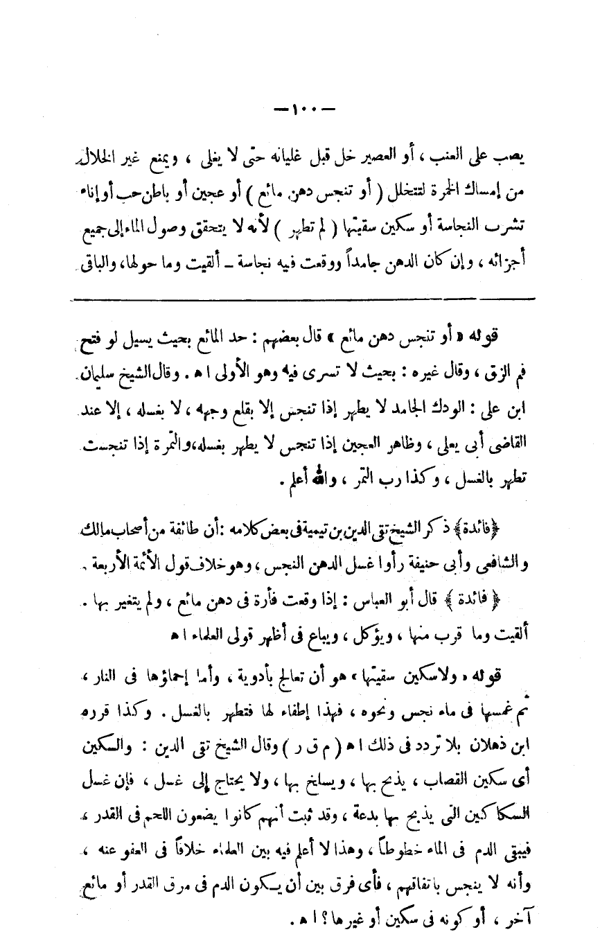 يصب على العنب أو العصير خل قبل غليانه حتى لايغلي ويمنع غير خلال من إمساك الخمرة لتتخلل ( أو تنجس دهن مائع ) أو عجين أو باطن حب أو إناء تشرب النجاسة أو سكين سقيتها ( لم يطهر ) لأنه لايتحقق وصول الماء إلى جميع أجزائه وإن كان الدهن جامدا ووقعت فيه نجاسة ألقيت وما حولها والباقي