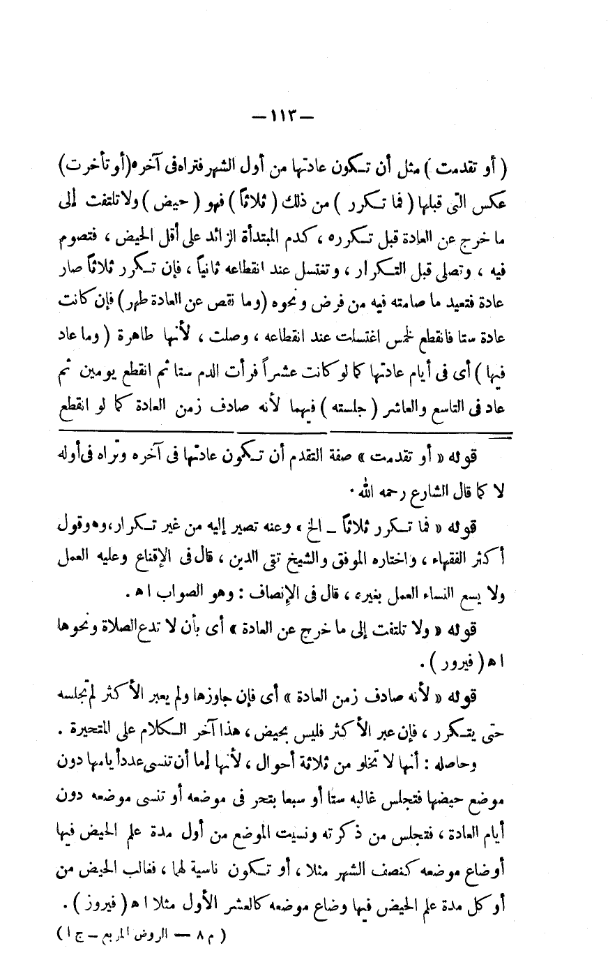 ( أو تقدمت ) مثل أن تكون عادتها من أول الشهر فتراه في آخره ( أو تأخرت ) عكس التي قبلها ( فما تكرر ) من ذلك ثلاثا ( ف ) هو ( حيض ) ولا تلتفت إلى ما خرج عن العادة قبل تكرره كدم المبتدأة الزائد على أقل الحيض فتصوم فيه وتصلي قبل التكرار وتغتسل عند انقطاعه ثانيا فإذا تكرر ثلاثا صار عادة فتعيد ما صامته ونحوه من فرض ( وما نقص عن العادة طهر ) فإن كانت عادتها ستا فانقطع لخمس اغتسلت عند انقطاعه وصلت لأنها طاهرة ( وما عاد فيها ) أي في أيام عادتها كما لو كانت عشرا فرأت الدم ستا ثم انقطع يومين ثم عاد في التاسع والعاشر ( جلسته ) فيهما لأنه صادف زمن العادة كما لو لم انقطع