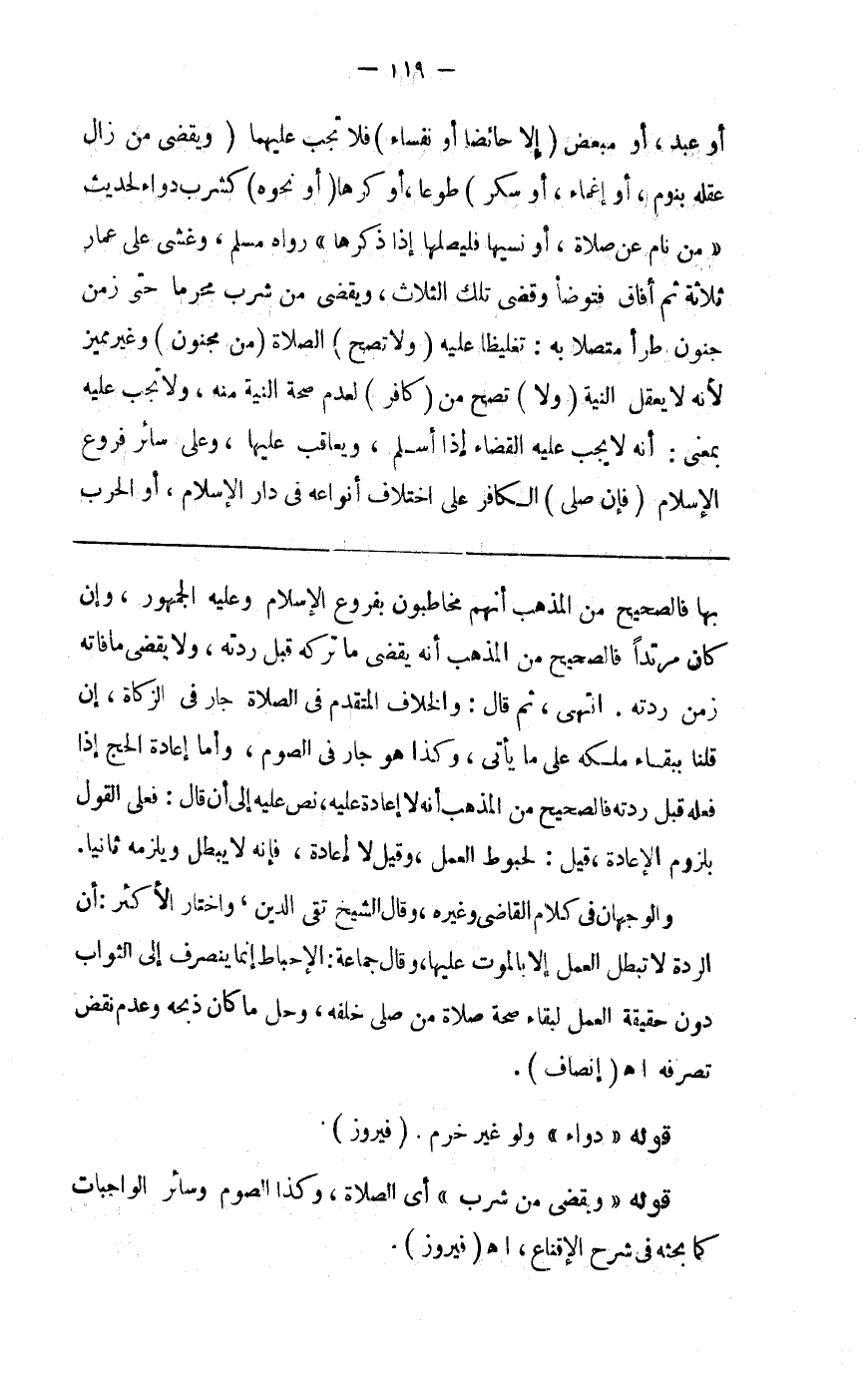 أو عبد أو مبعض ( إلا حائضا ونفساء ) فلا تجب عليهما 0 ( ويقضي من زال عقله بنوم أو إغماء أو سكر ) طوعا أو كرها ( أو نحوه ) كشرب دواء لحديث من نام عن صلاة أو نسيها فليصلها إذا ذكرها رواه مسلم وغشي على عمار ثلاثا ثم أفاق وتوضأ وقضى تلك الثلاث ويقضي من شرب محرما حتى زمن جنون طرأ متصلا به تغليظا عليه 0 ( ولا تصح ) الصلاة ( من مجنون ) وغير مميز لأنه لايعقل النية ( ولا ) تصح من ( كافر ) لعدم صحة النية منه ولا تجب عليه بمعنى أنه لا يجب عليه القضاء إذا أسلم ويعاقب عليها وعلى سائر فروع الإسلام ( فإن صلى ) الكافر على اختلاف أنواعه في دار الإسلام أو الحرب