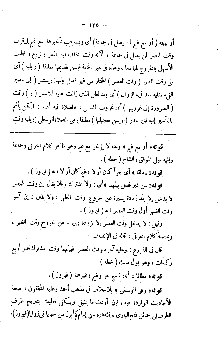 أو في بيته ( أو مع غيم لمن يصلي جماعة ) أي ويستحب تأخيرها مع غيم إلى قرب وقت العصر لمن يصلي جماعة لأنه وقت يخاف فيه المطر والريح فطلب الأسهل بالخروج لهما معا وهذا في غير الجمعة فيسن تقديمها مطلقا ( ويليه ) أي يلي وقت الظهر ( وقت العصر ) المختار من غير فصل بينهما ويستمر ( إلى مصير الفيء مثليه بعد فيء الزوال ) أي بعد الظل الذي زالت عليه الشمس ( و ) وقت ( الضرورة إلى غروبها ) أي غروب الشمس فالصلاة فيه أداء لكن يأتم بالتأخير إليه لغير عذر ( ويسن تعجيلها ) مطلقا وهي الصلاة الوسطى ( ويليه وقت
