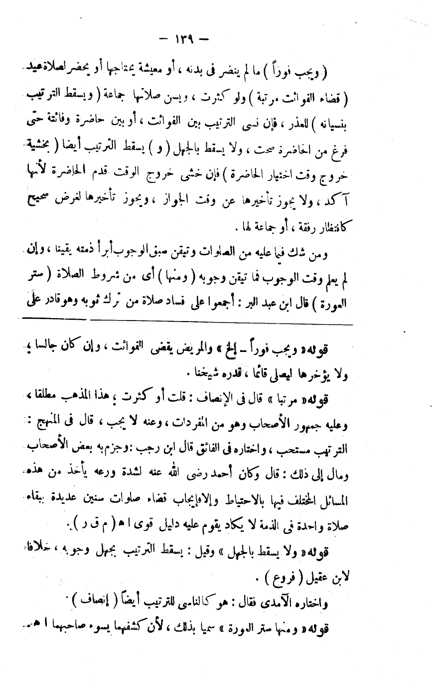 ( ويجب فورا ) ما لم يتضرر في بدنه أو معيشة يحتاجها أو يحضر لصلاة عيد ( قضاء الفوائت مرتبه ولو كثرت ويسن صلاتها جماعة ( ويسقط الترتيب بنسيانه ) للعذر فإن نسي الترتيب بين الفوائت أو بين حاضرة وفائتة حتى فرغ من الحاضرة صحت ولا يسقط بالجهل ( و ) يسقط الترتيب أيضا ( بخشية خروج وقت اختيار الحاضرة ) فإن خشي خروج الوقت قدم الحاضرة لأنها آكد ولا يجوز تأخيرها عن وقت الجواز ويجوز التأخير لغرض صحيح كانتظار رفقة أو جماعة لها ومن شك فيما عليه من الصلوات وتيقن سبق الوجوب أبرأ ذمته يقينا وإن لم يعلم وقت الوجوب فمما تيقن وجوبه ستر العورة ( ومنها ) أي من شروط الصلاة ( ستر العورة ) قال ابن عبد البر أجمعوا على فساد صلاة من ترك ثوبه وهو قادر على