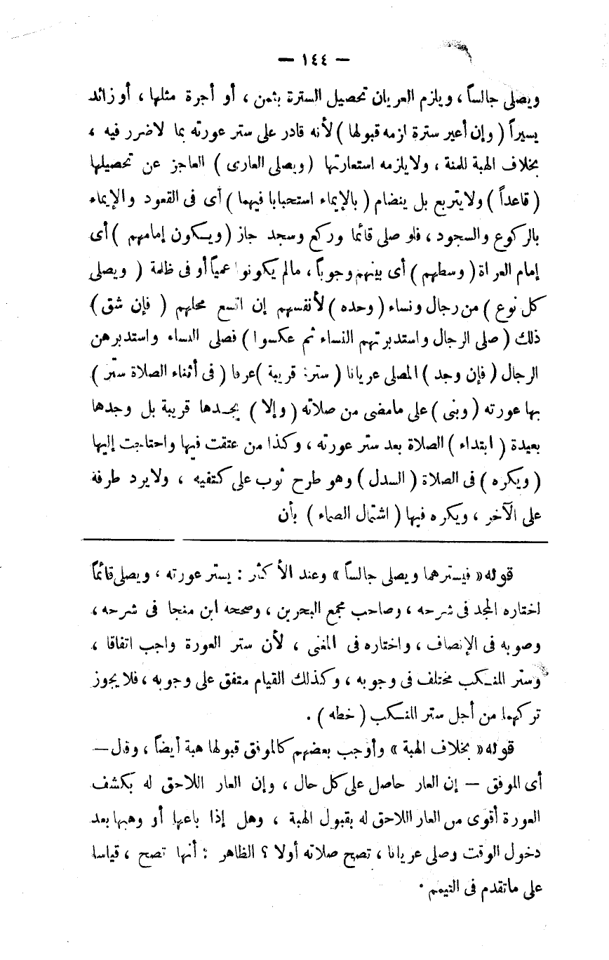 ويصلي جالسا ويلزم العريان تحصيل السترة بثمن أو أجرة مثلها أو زائد يسيرا (وإن أعير سترة لزمه قبولها) لأنه قادر على ستر عورته بما لا ضرر فيه بخلاف الهبة للمنة ولا يلزمه استعارتها (ويصلي العاري) العاجز عن تحصيلها (قاعدا) ولا يتربع بل يتضام (بالإيماء استحبابا فيهما) أي في العقود والإيماء بالركوع والسجود فلو صلى قائما وركع وسجد جاز (ويكون إمامهم) أي إمام العراة (وسطهم) أي بينهم وجوبا مالم يكونوا عميا أو في ظلمة (ويصلي كل نوع) من رجال ونساء (وحده) لأنفسهم إن اتسع محلهم (فإن شق) ذلك (صلى الرجال واستدبرتهم النساء ثم عكسوا) فصلى النساء واستدبرهن الرجال (فإن وجد) المصلي عريانا (ستره قريبة) عرفا (في أثناء الصلاة ستر) بها عورته (وبنى) على ما مضى من صلاته (وإلا) يجدها قريبة بل وجدها بعيدة (ابتدأ) الصلاة بعد ستر عورته وكذا من عتقت فيها واحتاجت إليها (ويكره في الصلاة السدل) وهو طرح ثوب على كتفيه ولا ير د طرفه على الآخر (و) ويكره فيها (اشتمال الصماء) بأن
