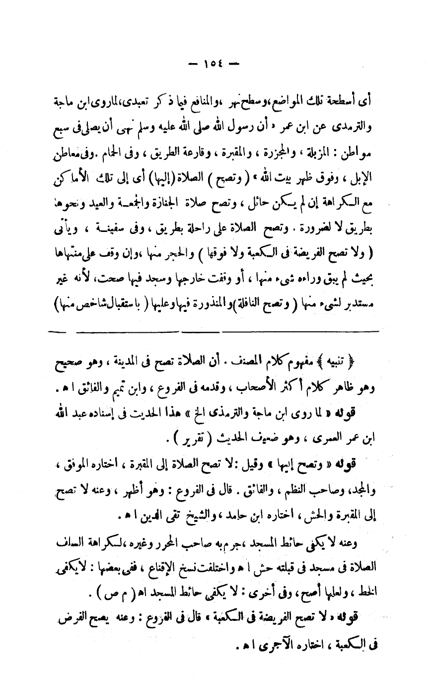 أي أسطحة تلك المواضع وسطح نهر والمنع فيما ذكر تعبدي لما روى ابن ماجه والترمذي عن ابن عمر أن رسول الله صلى الله عليه وسلم نهي أن يصلي في سبع مواطن المزبلة والمجزرة والمقبرة وقارعة الطريق وفي الحمام وفي معاطن الإبل وفوق ظهر بيت الله ( وتصح ) الصلاة ( إليها ) أي إلى تلك الأماكن مع الكراهة إن لم يكن حائل وتصح صلاة الجنازة والجمعة والعيد ونحوها بطريق لضرورة وتصح الصلاة على راحلة بطريق وفي سفينة ويأتي ( ولا تصح الفريضة في الكعبة ولا فوقها ) والحجر منها وإن وقف على منتهاها بحيث لم يبق وراءه شيء منها أو وقف خارجها وسجد فيها صحت لأنه غير مستدبر لشيء منها ( وتصح النافلة ) والمنذورة فيها وعليها ( باستقبال شاخص منها )