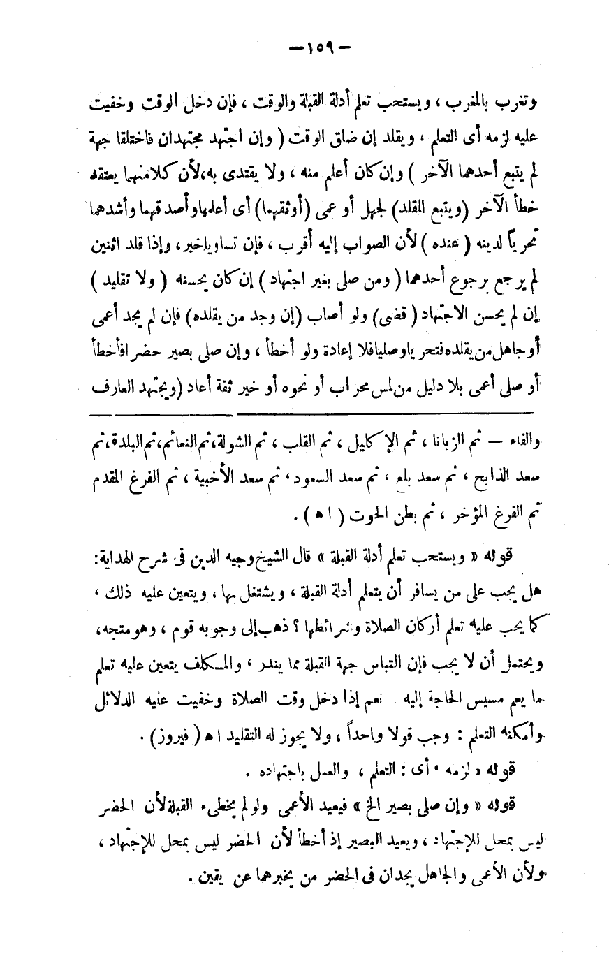 وتغرب بالمغرب ويستحب تعلم أدلة القبلة والوقت فإن دخل الوقت وخفيت عليه لزمه أي التعلم ويقلد إن ضاق الوقت ( وإن اجتهد مجتهدان فاختلفا في جهة لم يتبع أحدهما الآخر ) وإن كان أعلم منه ولا يقتدي به لأن كلا منهما خطأ الآخر ( ويتبع المقلد ) لجهل أو عمى ( أو ثقهما ) أي أعلمهما وأصدقهما وأشدهما تحريا لدينه ( عنده ) لأن الصواب إليه أقرب فإن تساويا خير ( وإذا قلد اثنين لم يرجع برجوع أحدهما ومن صلى بغير اجتهاد ) إن كان يحسنه ( ولا تقليد ) إن لم يحسن الاجتهاد ( قضى ) ولو أصاب ( إن وجد من يقلده ) فإن لم يجد أعمى أو جاهل من يقلده فتحريا وصليا فلا إعادة وإن صلى بصير حضرا فأخطأ أو صلى أعمى بلا دليل من لمس محراب أو نحوه أو خبر ثقة أعاد 0 ( ويجتهد العارف
