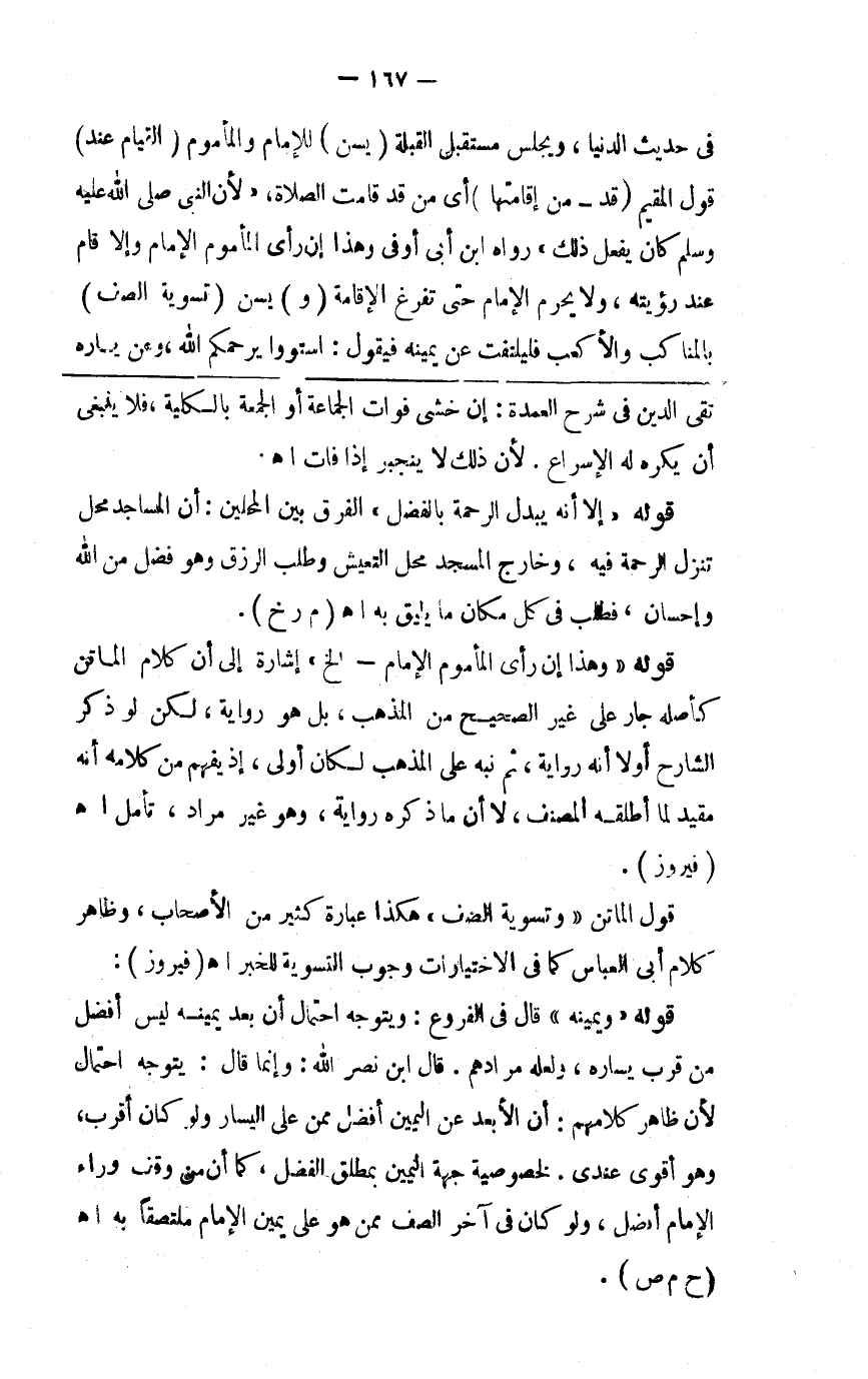 في حديث الدنيا ويجلس مستقبل القبلة 0 ( يسن ) للإمام فالمأموم ( القيام عند ) قول المقيم ( قد قامت الصلاة ) لأن النبي صلى الله عليه وسلم كان يفعل ذلك رواه ابن أبي أوفى وهذا إن رأى المأموم الإمام وإلا قام عند رؤيته ولايحرم الإمام حتى تفرغ الإقامة و تسن ( تسوية الصف ) بالمناكب والأكعب فليلتفت عن يمينه فيقول استووا يرحمكم الله وعن يساره