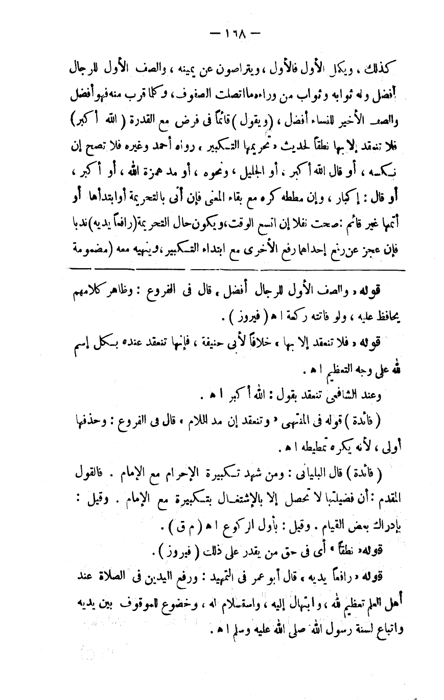 كذلك ويكمل الأول فالأول ويتراصون عن يمينه والصف الأول للرجال أفضل وله ثوابه وثواب من وراءه ما اتصلت الصفوف وكلما قرب منه فهو أفضل والصف الأخير للنساء أفضل تكبيرة الإحرام ( ويقول ) قائما في فرض مع القدرة ( الله أكبر ) فلا تنعقد إلا بها نطقا لحديث تحريمها التكبير رواه أحمد وغيره فلا تصح إن نكسه أو قال الله أكبر أو الجليل ونحوه أو مد همزة الله أكبر أو قال أكبار وإن مططه كره مع بقاء المعنى فإن أتى بالتحريمة أو ابتدأها أو أتمها غير قائم صحت نفلا إن اتسع الوقت ويكون حال التحريمة ( رافعا يديه ) ندبا فإن عجز عن رفع إحداهما رفع الأخرى مع ابتداء التكبير وينهيه معه ( مضمومة