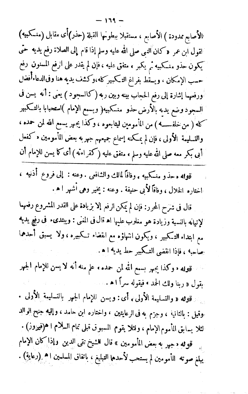 الأصابع ممدودة) الأصابع مستقبلا ببطونهما القبلة (حذو) أي مقابل (منكبيه) لقول ابن عمر كان رسول الله صلى الله عليه وسلم إذا قام إلى الصلاة رفع يديه حتى يكونا حذو منكبيه ثم يكبر متفق عليه فإن لم يقدر على الرفع المسنون رفع حسب الإمكان ويسقط بفراغ التكبير كله وكشف يديه هنا وفي الدعاء أفضل ورفعهما إشارة إلى رفع الحجاب بينه وبين ربه (كالسجود) يعني أنه يسن في السجود وضع يديه بالأرض حذو منكبيه (ويسمع الإمام) استحبابا بالتكبير كله (من خلفه) من المأمومين ليتابعوه وكذا يجهر ب سمع الله لمن حمده والتسليمة الأولى فإن لم يمكنه إسماع جميعهم جهر به بعض المأمومين لفعل أبي بكر معه صلى الله عليه وسلم متفق عليه (كقراءته) أي كما يسن للإمام أن