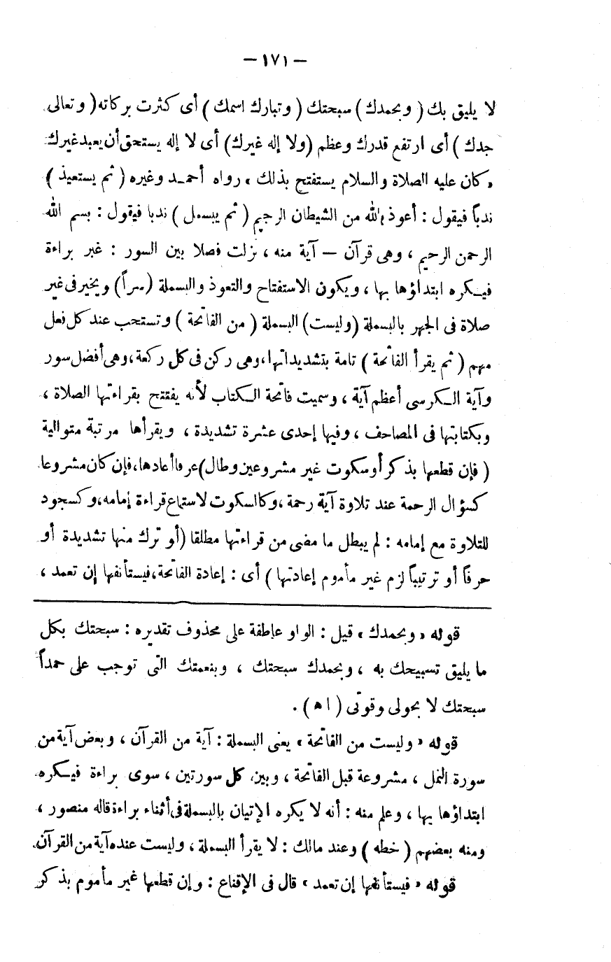 لا يليق بك ( وبحمدك ) سبحتك ( وتبارك اسمك ) أي كثرت بركاته ( وتعالى جدك ) أى ارتفع قدرك وعظم ( ولا إله غيرك ) أي لا إله يستحق أن يعبد غيرك كان صلى الله عليه وسلم يستفتح بذلك رواه أحمد وغيره ( ثم يستعيذ ) ندبا فيقول أعوذ بالله من الشيطان الرجيم ( ثم يبسمل ) ندبا فيقول بسم الله الرحمن الرحيم وهي قرآن آية منه نزلت فصلا بين السور غير براءة فيكره ابتداؤها بها ويكون الاستفتاح والتعوذ والبسملة ( سرا ) ويخير في غير صلاة في الجهر بالبسملة ( وليست ) البسملة ( من الفاتحة ) وتستحب عند كل فعل مهم ( ثم يقرأ الفاتحة ) تامة بتشديداتها وهي ركن في كل ركعة وهي أفضل سورة وآية الكرسي أعظم آية وسميت فاتحة الكتاب لأنه يفتح بقراءتها الصلاة وبكتابتها في المصاحف وفيها إحدى عشرة تشديدة ويقرأها مرتبة متوالية ( فإن قطعها بذكر أو سكوت غير مشروعين وطال ) عرفا أعادها فإن كان مشروعا كسؤال الرحمة عند تلاوة آية رحمة وكالسكوت لاستماع قراءة إمامه وكسجوده للتلاوة مع إمامه لم يبطل ما مضى من قراءتها مطلقا ( أو ترك منها تشديدة أو حرفا أو ترتيبا لزم غير مأموم إعادتها ) أي إعادة الفاتحة فيستأنفها إن تعمد