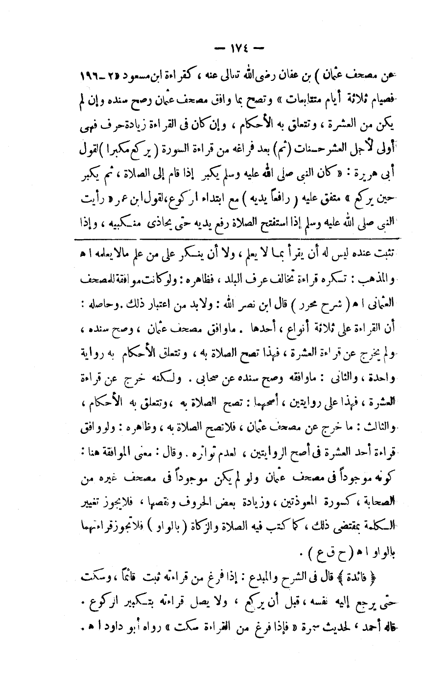 عن مصحف عثمان ) بن عفان رضي الله تعالى عنه كقراءة ابن مسعود فصيام ثلاثة أيام متتابعات وتصح بما وافق مصحف عثمان وصح سنده وإن لم يكن من العشرة وتتعلق به الأحكام وإن كان في القراءة زيادة حرف فهي أولى لأجل العشر حسنات هيئات الركوع والسجود والذكر فيهما ( ثم ) بعد فراغه من قراءة السورة ( يركع مكبرا ) لقول أبي هريرة كان النبي صلى الله عليه وسلم يكبر إذا قام إلى الصلاة ثم يكبر حين يركع متفق عليه ( رافعا يديه ) مع ابتداء الركوع لقول ابن عمر رأيت النبي صلى الله عليه وسلم إذا استفتح الصلاة رفع يديه حتى يحاذي منكبيه وإذا
