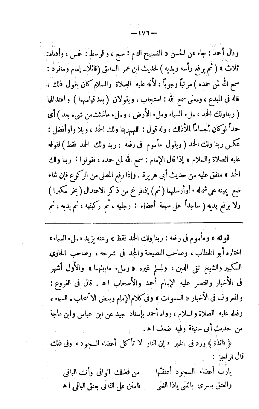وقال أحمد جاء عن الحسن التسبيح التام سبع والوسط خمس وأدناه ثلاث ( ثم يرفع رأسه ويديه ) لحديث ابن عمر السابق ( قائلا إمام ومنفرد سمع الله لمن حمده ) مرتبا وجوبا لأنه صلى الله عليه وسلم كان يقول ذلك قاله في المبدع ومعنى سمع استجاب ( و ) يقولان ( بعد قيامهما ) واعتدالهما ( ربنا ولك الحمد ملء السماء وملء الأرض وملء ما شئت من شيء بعد ) أي حمدا لو كان أجساما لملأ ذلك وله قول اللهم ربنا ولك الحمد وبلا واو أفضل عكس ربنا لك الحمد ( و ) يقول ( مأموم في رفعه ربنا ولك الحمد فقط ) لقوله صلى الله عليه وسلم إذا قال الإمام سمع الله لمن حمده فقولوا ربنا ولك الحمد متفق عليه من حديث أبي هريرة وإذا رفع المصلي من الركوع فإن شاء وضع يمينه على شماله أو أرسلهما ( ثم ) إذا فرغ من ذكر الاعتدال ( يخر مكبرا ) ولا يرفع يديه ( ساجدا على سبعة أعضاء رجليه ثم ركبتيه ثم يديه ثم