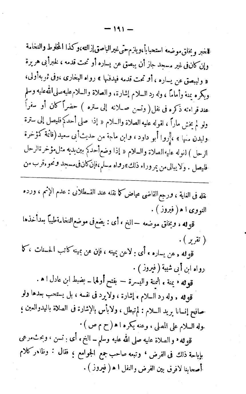 للخبر ويخلق موضعه استحبابا ويلزم حتى غير الباصق إزالته وكذا المخاط والنخامة وإن كان في غير مسجد جاز أن يبصق عن يساره أو تحت قدميه لخبر أبي هريرة وليبصق عن يساره أو تحت قدمه فيدفنها رواه البخاري وفي ثوبه أولى ويكره يمنة وأماما وله رد السلام إشارة والصلاة والسلام عليه صلى الله عليه وسلم عند قراءته ذكره في نفل (وتسن صلاته إلى سترة) حضرا كان أو سفرا ولو لم يخش مارا لقوله صلى الله عليه وسلم إذا صلى أحدكم فليصل إلى سترة وليدن منها رواه أبو داود وابن ماجه من حديث أبي سعيد (قائمة كمؤخرة الرحل) لقوله صلى الله عليه وسلم إذا وضع أحدكم بين يديه مثل مؤخرة الرحل فليصل ولا يبال من يمر وراء ذلك رواه مسلم فإن كان في مسجد ونحوه قرب من