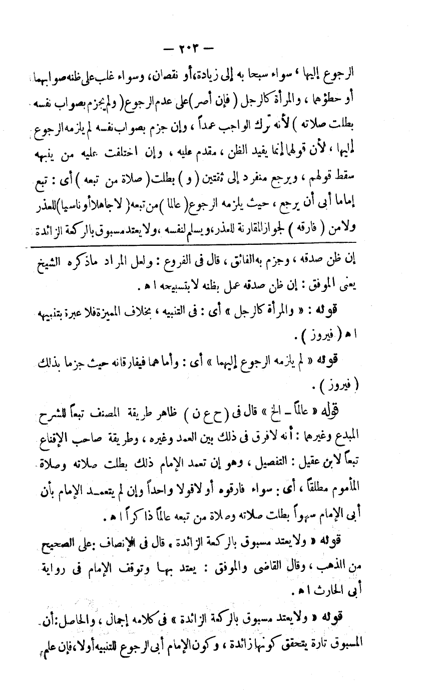الرجوع إليها سواء سبحا به إلى زيادة أو نقصان وسواء غلب على ظنه صوابهما أو خطؤهما والمرأة كالرجل ( ف ) إن ( أصر ) على عدم الرجوع ( ولم يجزم بصواب نفسه بطلت صلاته ) لأنه ترك الواجب عمدا وإن جزم بصواب نفسه لم يلزمه الرجوع إليهما لأن قولهما إنما يفيد الظن واليقين مقدم عليه وإن اختلف عليه من ينبهه سقط قولهم ويرجع منفرد إلى ثقتين ( و ) بطلت ( صلاة من تبعه ) أي تبع إماما أبى أن يرجع حيث يلزمه الرجوع ( عالما لا ) من تبعه ( جاهلا أو ناسيا ) للعذر ( ولا من فارقه ) لجواز المفارقة للعذر ويسلم لنفسه ولا يعتد مسبوق بالركعة الزائدة