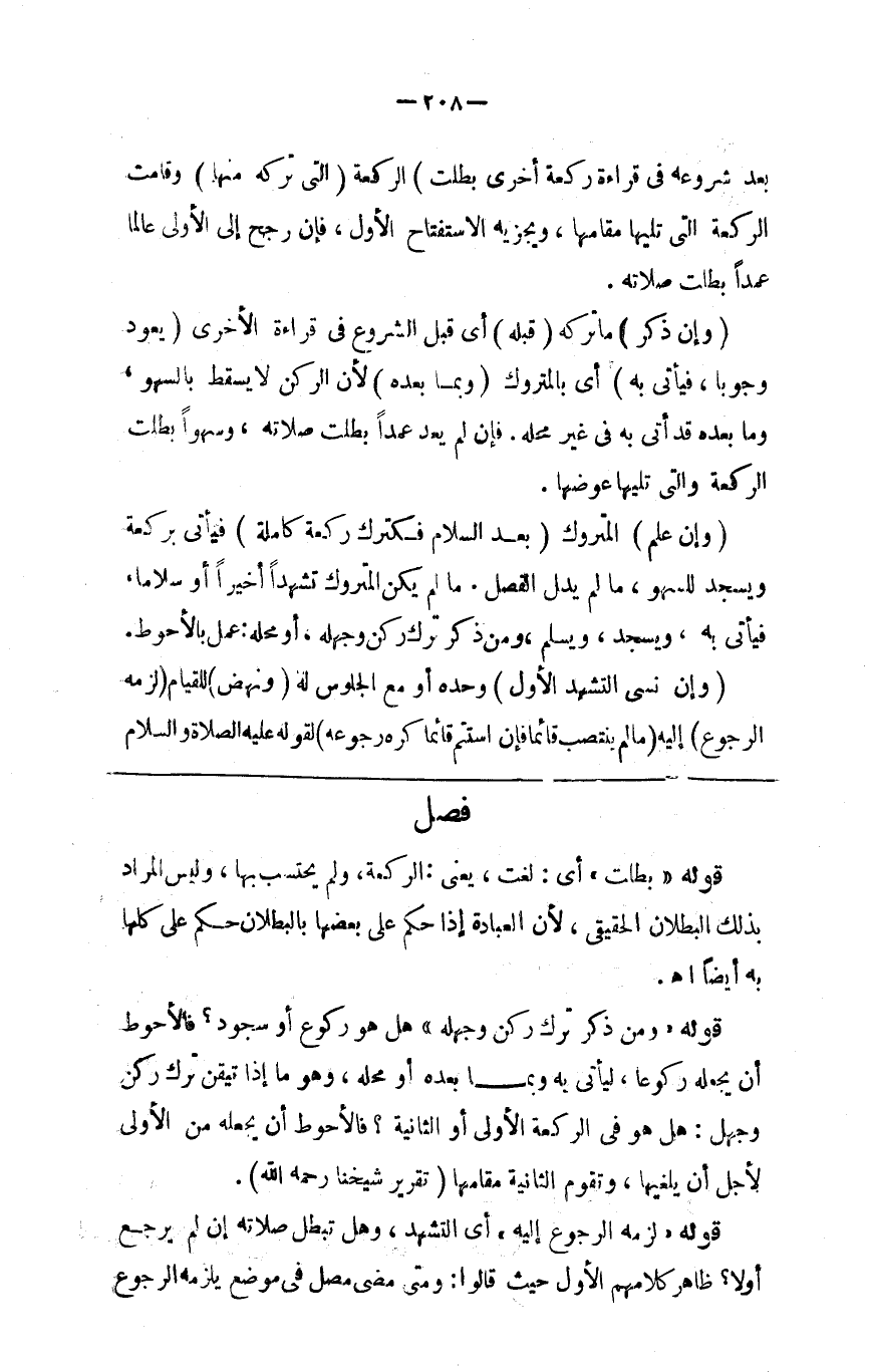بعد شروعه في قراءة ركعة أخرى بطلت ) الركعة ( التي ترك منها ) وقامت الركعة التى تليها مقامها ويجزيه الاستفتاح الأول فإن رجع إلى الأولى عالما عمدا بطلت صلاته ( و ) إن ذكر ما تركه ( قبله ) أي قبل الشروع في قراءة الأخرى ( يعود وجوبا فيأتي به ) أي بالمتروك ( وبما بعده ) لأن الركن لا يسقط بالسهو وما بعده قد أتى به في غير محله فإن لم يعد عمدا بطلت صلاته وسهوا بطلت الركعة والتي تليها عوضها ( وإن علم ) المتروك ( بعد السلام فكترك ركعة كاملة ) فيأتي بركعة ويسجد لسهو ما لم يطل الفصل ما لم يكن المتروك تشهدا أخيرا أو سلاما فيأتي به ويسجد ويسلم ومن ذكر ترك ركن وجهله أو محله عمل بالأحوط ( وإن نسي التشهد الأول ) وحده أو مع الجلوس له ( ونهض ) للقيام ( لزمه الرجوع ) إليه ( مالم ينتصب قائما فإن استتم قائما كره رجوعه ) لقوله صلى الله عليه وسلم