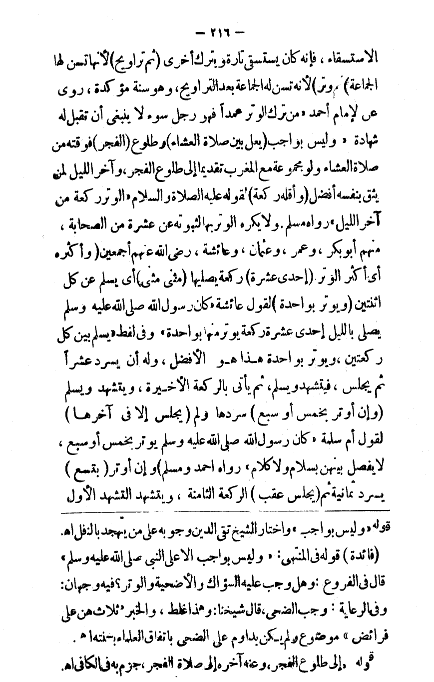 الاستسقاء فإنه كان يستسقي تاره ويترك أخرى ( ثم تراويح ) لأنها تسن لها الجماعة ( ثم وتر ) لأنه تسن له الجماعة بعد التراويح وهو سنة مؤكدة روي عن الإمام من ترك الوتر عمدا فهو رجل سوء لا ينبغي أن تقبل له شهادة وليس بواجب ( يفعل بين ) صلاة ( العشاء و ) طلوع ( الفجر ) فوقته من صلاة العشاء ولو مجموعة مع المغرب تقديما إلى طلوع الفجر وآخر الليل لم يثق بنفسه أفضل سنة الوتر ( وأقله ركعة واحدة ) لقوله عليه الصلاة والسلام الوتر ركعة من آخر الليل رواه مسلم ولا يكره الوتر بها لثبوته عن عشرة من الصحابة منهم أبو بكر وعمر وعثمان وعائشة رضي الله عنهم ( وأكثره ) أي أكثر الوتر ( إحدى عشرة ) ركعة يصليها ( مثنى مثنى ) أي يسلم من كل ثنتين ( ويوتر بواحدة ) لقول عائشة كان رسول الله صلى الله عليه وسلم يصلي بالليل إحدى عشرة ركعة يوتر منها بواحدة وفي لفظ يسلم بين كل ركعتين ويوتر بواحدة هذا هو الأفضل وله أن يسرد عشرا ثم يجلس فيتشهد ولا يسلم ثم يأتي بالركعة الأخيرة ويتشهد ويسلم ( وإن أوتر بخمس أو سبع ) سردها و ( لم يجلس إلا في آخرها ) لقول أم سلمه كان رسول الله صلي الله وعليه وآله وسلم يوتر بسبع وبخمس لا يفصل بينهن بسلام ولا كلام رواه أحمد ومسلم ( و ) إن أوتر ( بتسع ) بسرد ثمانية ثم ( يجلس عقب ) الركعة ( الثامنة ويتشهد ) التشهد الأول