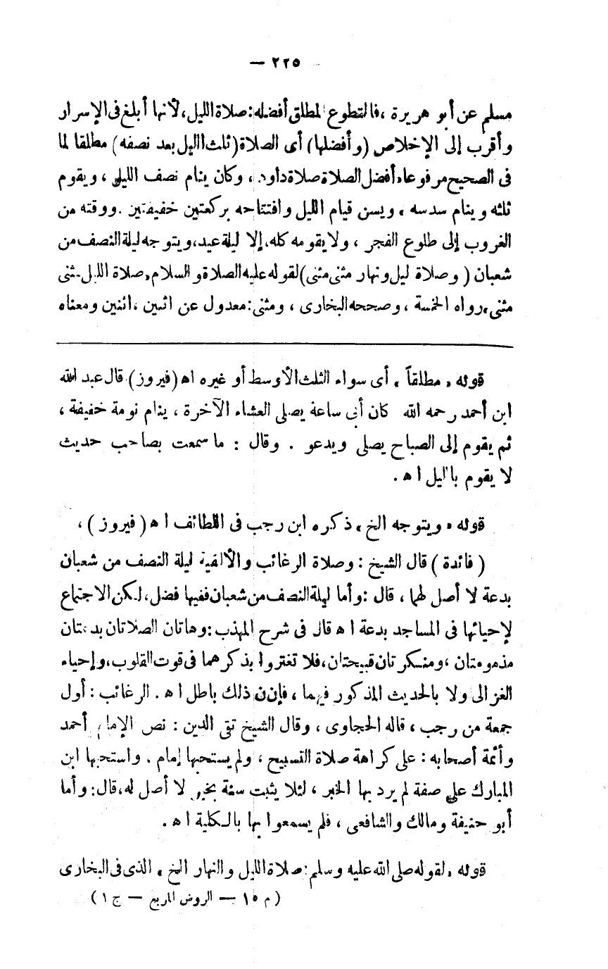 مسلم عن أبي هريرة فالتطوع المطلق أفضله صلاة الليل لأنه أبلغ في الإسرار وأقرب إلى الإخلاص ( وأفضلها ) أي الصلاة ( ثلث الليل بعد نصفه ) مطلقا لما في الصحيح مرفوعا أفضل الصلاة صلاة داود كان ينام نصف الليل ويقوم ثلثه وينام سدسه ويسن قيام الليل وافتتاحه بركعتين خفيفتين ووقته من الغروب إلى طلوع الفجر ولا يقومه كله إلا ليلة عيد ويتوجه ليلة النصف من شعبان ( وصلاة ليل ونهار مثنى مثنى ) لقوله صلى الله عليه وسلم صلاة الليل مثنى مثنى رواه الخمسة وصححه البخاري ومثنى معدول عن اثنين اثنين ومعناه