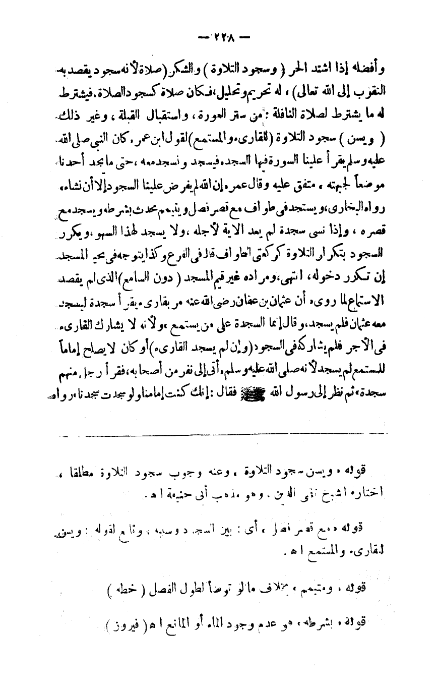 وأفضله إذا اشتد الحر سجود التلاوة والشكر ( وسجود التلاوة ) والشكر ( صلاة ) لأنه سجود يقصد به التقرب إلى الله تعالي له تحريم وتحليل فكان صلاة كسجود الصلاة فيشترط له ما يشترط لصلاة النافلة من ستر العورة واستقبال القبلة والنية وغير ذلك و ( يسن ) سجود التلاوة ( للقارىء والمستمع ) لقول ابن عمر كان النبي صلى الله عليه وسلم يقرأ علينا السورة فيها السجدة فيسجد ونسجد معه حتي ما يجد أحدنا موضعا لجبهته متفق عليه وقال عمر إن الله لم يفرض علينا السجود إلا أن نشاء رواه البخاري ويسجد في طواف مع قصر فصل ويتيمم محدث بشرطه ويسجد مع قصره وإذا نسي سجدة لم يعد الآية لأجله ولايسجد لهذا السهو ويكرر السجود بتكرار التلاوة كركعتي الطواف قال في الفروع وكذا يتوجه في تحية المسجد أن تكرر دخوله اه ومراده غير قيم المسجد ( دون السامع ) الذي لم يقصد الاستماع لما روي أن عثمان بن عفان رضي الله عنه مر بقارئ يقرأ سجدة ليسجد معه عثمان فلم يسجد وقال إنما السجدة على من استمع ولأنه لايشارك القارئ في الأجر فلم يشاركه في السجود ( وإن لم يسجد القارئ ) أو كان لايصلح إماما للمستمع ( لم يسجد ) لأنه صلى الله عليه وسلم أتى إلى نفر من أصحابه فقرأ رجل منهم سجدة ثم نظر إلى رسول الله صلى الله عليه وسلم فقال إنك كنت إمامنا ولو سجدت سجدنا رواه