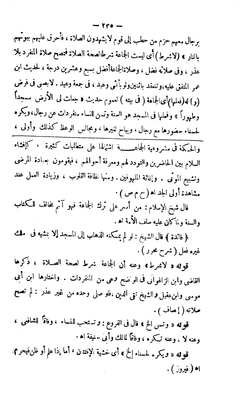 برجال معهم حزم من حطب إلى قوم لا يشهدون الصلاة فأحرق عليهم بيوتهم بالنار ( لا شرطا ) أي ليست الجماعة شرطا لصحة الصلاة فتصح صلاة المنفرد بلا عذر وفي صلاته فضل وصلاة الجماعة أفضل بسبع وعشرين درجة لحديث ابن عمر المتفق عليه وتنعقد باثنين ولو بأنثى وعبد في غير جمعة وعيد لا صبي في فرض ( وله فعلها ) أي الجماعة ( في بيته ) لعموم حديث جعلت لي الأرض مسجدا وطهورا وفعلها في المسجد هو السنة وتسن لنساء منفردات عن رجال ويكره لحسناء حضورها مع رجال ويباح لغيرها ومجالس الوعظ كذلك وأولى