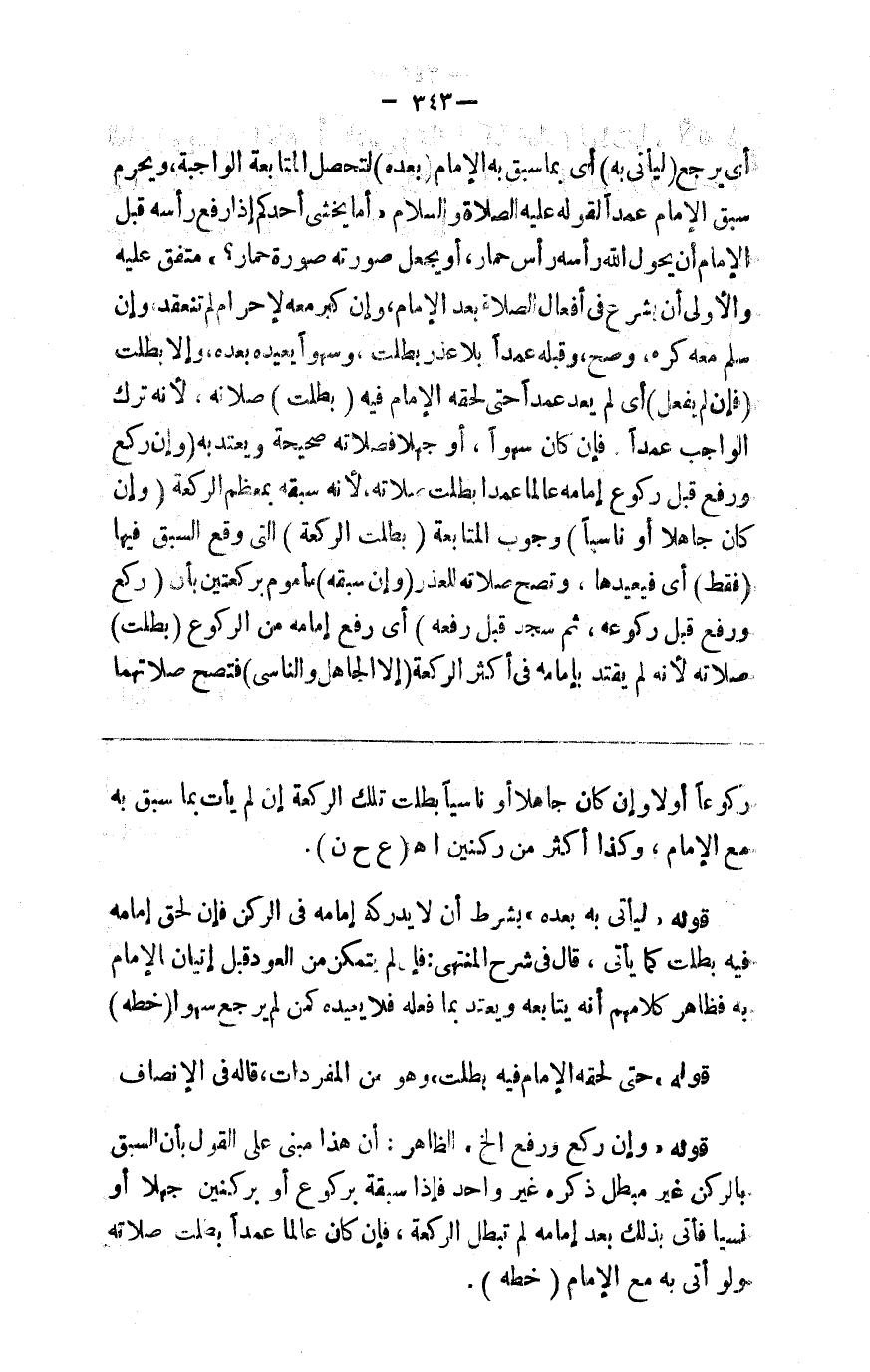 أي يرجع ( ليأتي به ) أي بما سبق به الإمام ( بعده ) لتحصيل المتا الواجبة ويحرم سبق الإمام عمدا لقوله صلى الله عليه وسلم أما يخشى أحدكم إذا رفع رأسه قبل الإمام أن يحول الله رأسه رأس حمار أو يجعل صورته صورة حمار متفق عليه والأولى أن يشرع في أفعال الصلاة بعد الإمام وإن كبر معه لإحرام لم تنعقد وإن سلم معه كره وصح وقبله عمدا بلا عذر بطلت وسهوا يعيده بعده وإلا بطلت ( فإن لم يفعل ) أي لم يعد ( عمدا ) حتى لحقه الإمام فيه ( بطلت ) صلاته لأنه ترك الواجب عمدا وإن كان سهوا أو جهلا فصلاته صحيحة ويعتد به ( وإن ركع ورفع قبل ركوع إمامه عالما عمدا بطلت ) صلاته لأنه سبقه بمعظم الركعة ( وإن كان جاهلا أو ناسيا ) وجوب المتابعة ( بطلت الركعة ) التي وقع السبق فيها ( فقط ) فيعيدها وتصح صلاته للعذر ( وإن ) سبقه مأموم بركعتين بأن ( ركع ورفع قبل ركوعه ثم سجد قبل رفعه ) أي رفع إمامه من الركوع ( بطلت ) صلاته لأنه لم يقتد بإمامه في أكثر الركعة ( إلا الجاهل والناسي ) فتصح صلاتهما