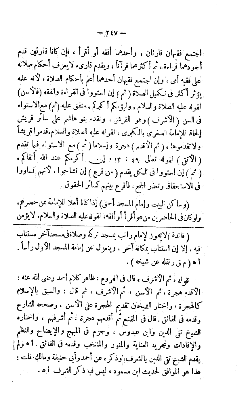اجتمع فقيهان قارئان وأحدهما أفقه أو أقرأ قدم فإن كانا قارئين قدم أجودهما قراءة ثم أكثرهما قرآنا ويقدم قارئ لايعرف أحكام صلاته على فقيه أمي وإن اجتمع فقيهان أحدهما أعلم بأحكام الصلاة قدم لأن علمه يؤثر في تكميل الصلاة ( ثم ) إن استووا في القراءة والفقه ( الأسن ) لقوله صلى الله عليه وسلم وليؤمكم أكبركم متفق عليه ( ثم ) مع الاستواء في السن ( الأشرف ) وهو القرشي وتقدم بنو هاشم على سائر قريش إلحاقا للإمامة الصغرى بالكبرى ولقوله صلى الله عليه وسلم قدموا قريشا ولا تقدموها ( ثم الأقدم هجرة ) أو إسلاما ( ثم ) مع الاستواء فيما تقدم ( الأتقى ) لقوله تعالى { إن أكرمكم عند الله أتقاكم } ثم إن استووا في الكل يقدم ( من قرع ) إن تشاحوا لأنهم تساووا في الاستحقاق وتعذر الجمع فأقرع بينهم كسائر الحقوق ( وساكن البيت وإمام المسجد أحق ) إذا كانا أهلا للإمامة بمن حضرهم ولو كانا في الحاضرين من هو أقرأ أو أفقه لقوله صلى الله عليه وسلم لايؤمن