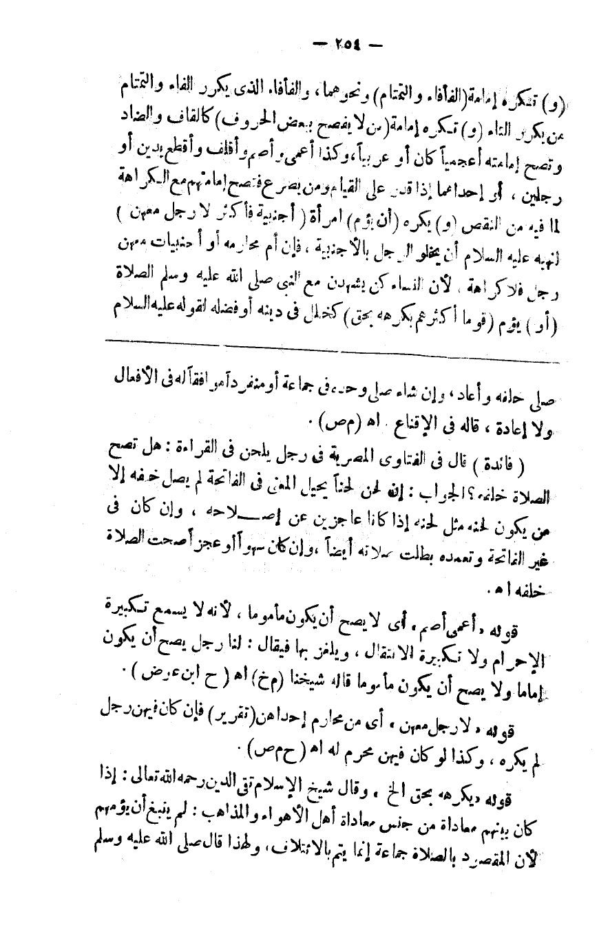 ( و ) تكره إمامة ( الفأفاء والتمتام ) ونحوهما والفأفاء الذي يكرر الفاء والتمتام من يكرر التاء ( و ) تكره إمامة ( من لا يفصح ببعض الحروف ) كالقاف والضاد وتصح إمامته أعجميا كان أو عربيا وكذا أعمى وأصم وأقلف وأقطع يدين أو رجلين أو إحداهما إذا قدر على القيام ومن يصرع فتصح إمامتهم مع الكراهة لما فيهم من النقص ( و ) يكره ( أن يؤم ) امرأة ( أجنبية فأكثر لا رجل معهن ) لنهيه صلى الله عليه وسلم أن يخلو الرجل بالأجنبية فإن أم محارمه أو أجنبيات معهن رجل فلا كراهة لأن النساء كن يشهدن مع النبي صلى الله عليه وسلم الصلاة ( أو ) أن يؤم ( قوما أكثرهم يكرهه بحق ) كخلل في دينه أو فضله لقوله صلى الله عليه وسلم