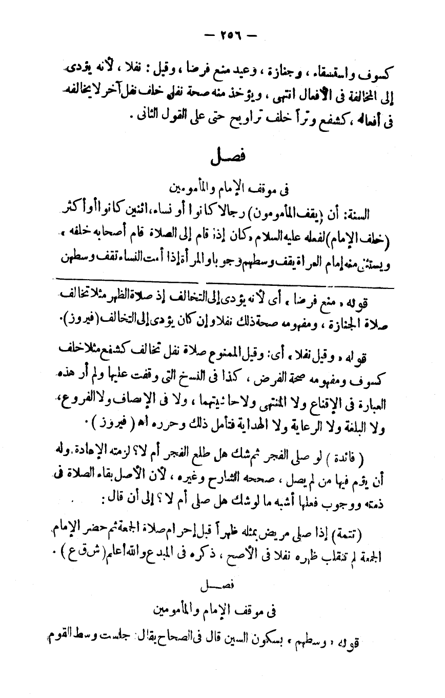 السنة أن ( يقف المأمومون ) رجالا كانوا أو نساء إن كانوا اثنين فأكثر ( خلف الإمام ) لفعله صلى الله عليه وسلم كان إذا قام إلى الصلاة قام أصحابه خلفه ويستثنى منه إمام العراة يقف وسطهم وجوبا والمرأة إذا أمت النساء تقف وسطه