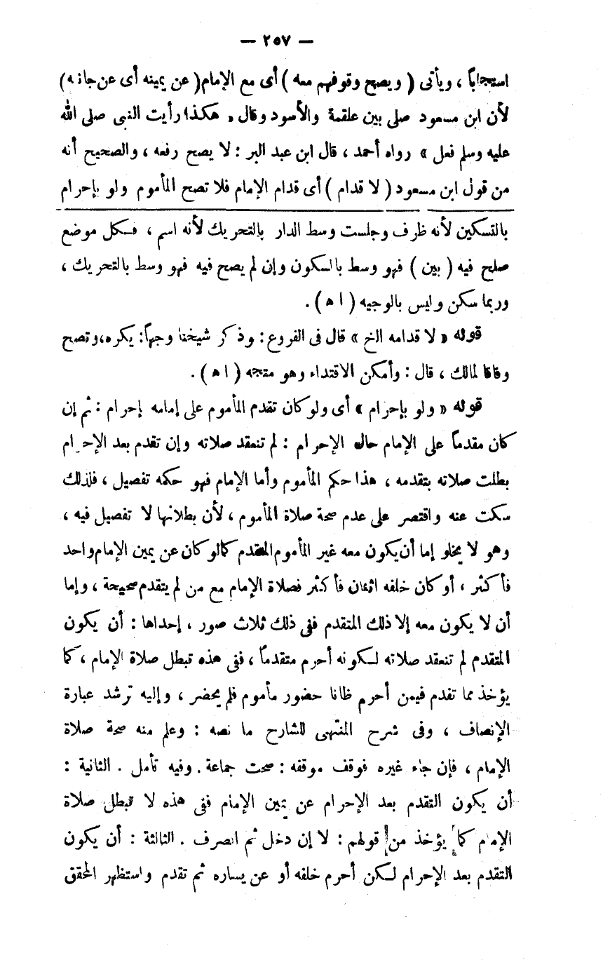 استحبابا ويأتي (ويصح) وقوفهم (معه) أي مع الإمام (عن يمينه أو عن جانبيه) لأن ابن مسعود صلى بين علقمة والأسود وقال هكذا رأيت النبي صلى الله عليه وسلم فعل رواه أحمد وقال ابن عبد البر لا يصح رفعه والصحيح أنه من قول ابن مسعود (لإقدامه) أي لاقدام الإمام فلا تصح للمأموم ولو بإحرام