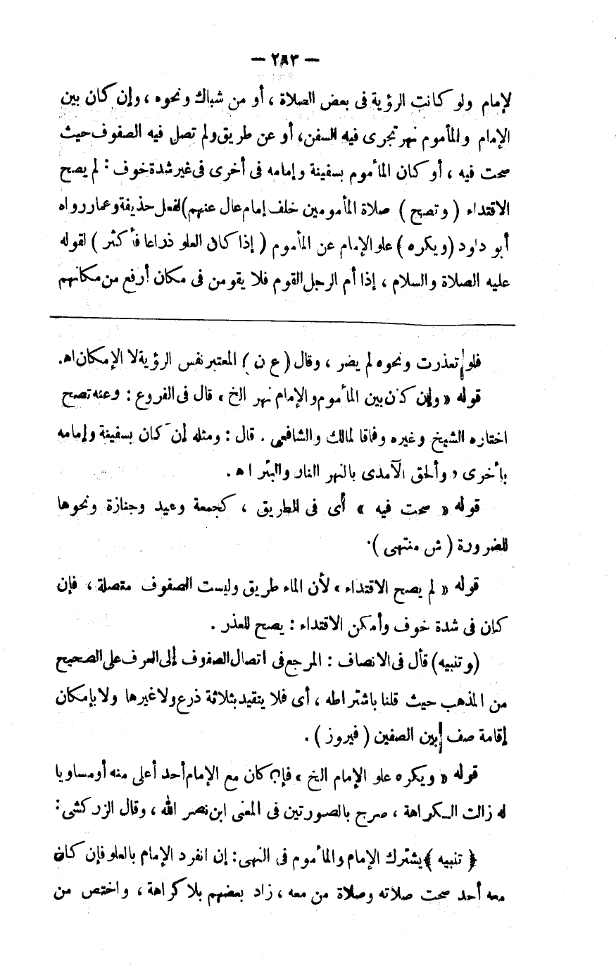 الإمام ولو كانت الرؤية في بعض الصلاة أو من شباك ونحوه وإن كان بين الإمام والمأموم نهر تجري فيه السفن أو طريق ولم تتصل فيه الصفوف حيث صحت فيه أو كان المأموم بسفينه وإمامه في أخرى في غير شدة خوف لم يصح الإقتداء ( وتصح ) صلاة المأمومين ( خلف إمام عال عنهم ) لفعل حذيفة وعمار رواه أبو داود ( ويكره ) علو الإمام عن المأموم ( إذا كان العلو ذراعا فأكثر ) لقوله صلى الله عليه وسلم إذا أم الرجل القوم فلا يقومن في مكان أرفع من مكانهم