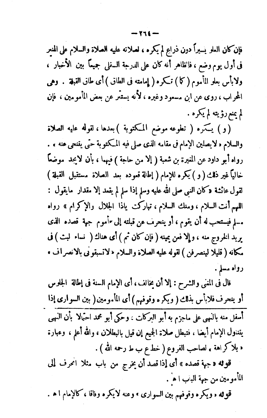 فإن كان العلو يسيرا دون ذراع لم يكره لصلاته صلى الله عليه وسلم على المنبر في أول يوم وضع فالظاهر أنه كان على الدرجة السفلى جمعا بين الأخبار ولا بأس بعلو المأموم ( ك ) ما تكره ( إمامته في الطاق ) أي طاق القبلة وهي المحراب روي عن ابن مسعود وغيره لأنه يستتر عن بعض المأمومين فإن لم يمنع رؤيته لم يكره ( و ) يكره ( تطوعه موضع المكتوبة ) بعدها لقوله صلى الله عليه وسلم لايصلين الإمام في مقامه الذي صلى فيه المكتوبة حتى يتنحى عنه رواه أبو داود عن المغيرة بن شعبة ( إلا من حاجة ) فيهما بأن لا يجد موضعا خاليا غير ذلك ( و ) يكره للإمام ( إطالة قعوده بعد الصلاة مستقبل القبلة ) لقول عائشه كان النبي صلى الله عليه وسلم إذا سلم لم يقعد إلا مقدار ما يقول اللهم أنت السلام ومنك السلام تباركت يا ذا الجلال والإكرام رواه مسلم فيستحب له أن يقوم أو ينحرف عن قبلته إلى مأموم جهة قصده وإلا فعن يمينه ( فإذا كان ثم ) أي هناك ( نساء لبث ) في مكانه ( قليلا لينصرفن ) لأنه صلى الله عليه وسلم وأصحابه كانوا يفعلون ذلك ويستحب أن لا ينصرف المأموم قبل إمامه لقوله صلى الله عليه وسلم لا تسبقوني بالإنصراف رواه مسلم قال في المغني و الشرح إلا أن يخالف الإمام السنة في إطالة الجلوس مستقبل القبلة أو لم ينحرف فلا بأس بذلك ( ويكره وقوفهم ) أي المأمومين ( بين السواري إذا