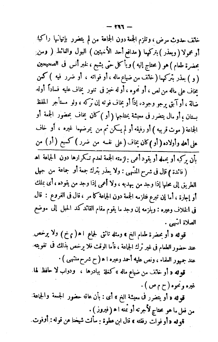 خائف حدوث مرض وتلزم الجمعة دون الجماعة من لم يتضرر بإتيانها راكبا أو محمولا ( و ) يعذر بتركهما ( مدافع أحد الأخبثين ) البول والغائط ( ومن بحضرة الطعام ) هو ( محتاج إليه ) ويأكل حتى يشبع لخبر أنس في الصحيحين ( و ) يعذر بتركهما ( خائف من ضياع ماله أو فواته أو ضررا فيه ) كمن يخاف على ماله من لص أو نحوه أو له خبز في تنور يخاف عليه فسادا أو له ضالة أو آبق يرجو وجوده إذا أو يخاف فوته إن تركه ولو مستأجرا لحفظ بستان أو مال أو يتضرر في معيشة يحتاجها ( أو ) كان يخاف بحضوره الجمعة أو الجماعة ( موت قريبه ) أو رفيقه أو لم يكن من يمرضهما غيره أو خاف على أهله أو ولده ( أو ) كان يخاف ( على نفسه من ضرر ) كسبع ( أو )