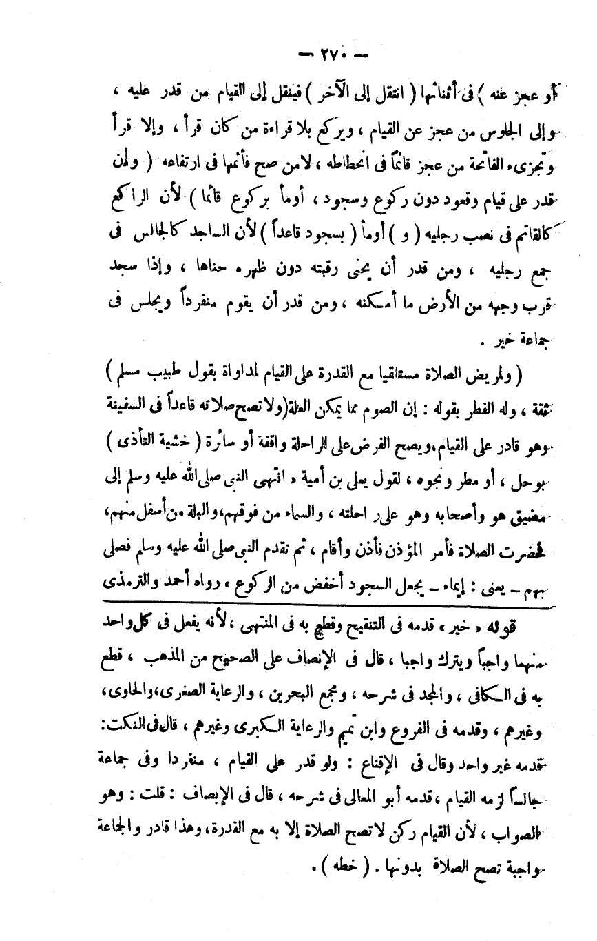 ( أو عجز ) عنه ( في أثنائها انتقل إلى الآخر ) فينتقل إلى القيام من قدر عليه وإلى الجلوس من عجز عن القيام ويركع بلا قراءة من كان قرأ وإلا قرأ وتجزئ الفاتحة من عجز فأتمها في انحطاطه لا من صح فأتمها في ارتفاعه ( وإن قدر على قيام وقعود دون ركوع وسجود أومأ بركوع قائما ) لأن الراكع كالقائم في نصف رجليه وأومأ ( بسجود قاعدا ) لأن الساجد كالجالس في جمع رجليه ومن قدر على أن يحني رقبته دون ظهره حناها وإذا سجد قرب وجهه من الأرض ما أمكنه ومن قدر أن يقوم منفردا ويجلس في جماعة خير ( ولمريض الصلاة مستلقيا مع القدرة على القيام لمداواة بقول طبيب مسلم ) ثقة وله الفطر بقوله إن الصوم مما يمكن العلة ( ولا تصح صلاته قاعدا في السفينة وهو قادر على القيام ) ويصح الفرض على الراحلة ) واقفة أو سائرة ( خشية التأذي ) بوحل أو مطر ونحوه لقول يعلى بن أمية انتهى النبي صلى الله عليه وسلم إلى مضيق هو وأصحابه وهو على راحلته والسماء من فوقهم والبلة من أسفل منهم فحضرت الصلاة فأمر المؤذن فأذن وأقام ثم تقدم النبي صلى الله عليه وسلم فصلى بهم يعني إيماء يجعل السجود أخفض من الركوع رواه أحمد والترمذي