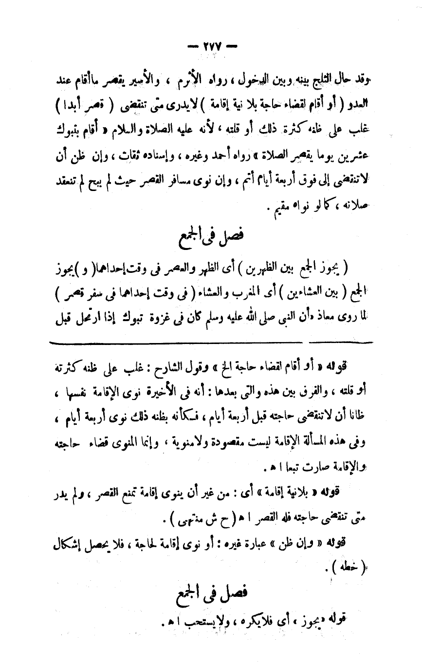 2 فصل في الجمع (يجوز الجمع بين الظهرين) أي الظهر والعصر في وقت إحداهما (و) يجوز الجمع (بين العشاءين) أي المغرب والعشاء (في وقت إحدههما في سفر قصر) لما روى معاذ أن النبي صلى الله عليه وسلم كان في غزوة تبوك إذا ارتحل قبل