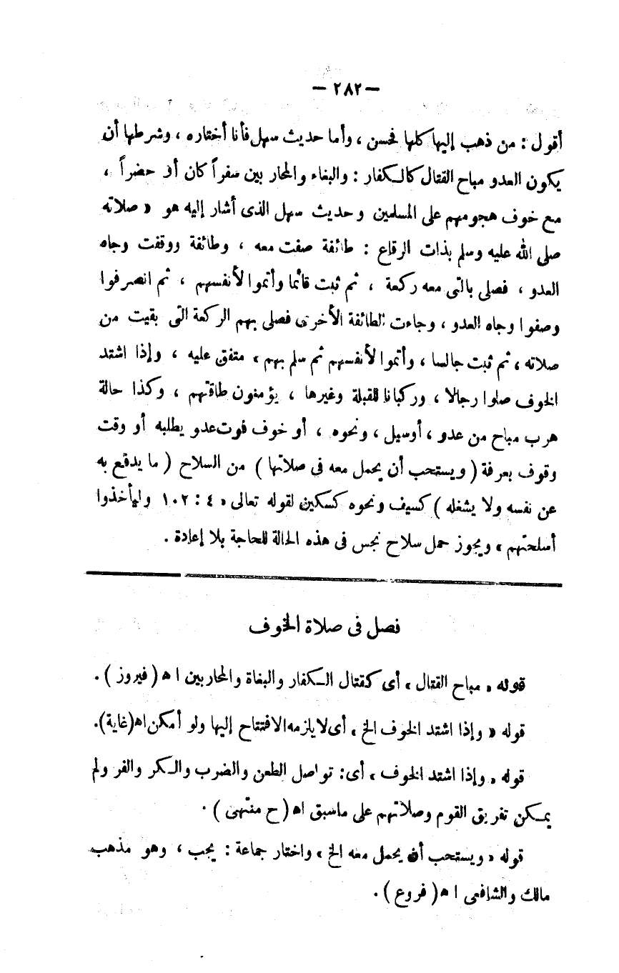 أقول من ذهب إليها كلها فحسن وأما حديث سهل فأنا اختاره وشرطها أن يكون العدو مباح القتال سفرا كان أو حضرا مع خوف هجومهم على المسلمين وحديث سهل الذي أشار إليه هو صلاته صلى الله عليه وسلم بذات الرقاع طائفة صفت معه وطائفة وقفت وجاه العدو فصلى بالتي معه ركعة ثم ثبت قائما وأتموا لأنفسهم ثم انصرفوا وصفوا وجاه العدو وجاءت الطائفة الأخرى فصلى بهم الركعة التي بقيت من صلاته ثم ثبت جالسا وأتموا لأنفسهم ثم سلم بهم متفق عليه وإذا اشتد الخوف صلوا رجالا وركبانا للقبلة وغيرها يومئون طاقتهم وكذا حالة هرب مباح من عدو أو سيل أو نحوه أو خوف فوت عدو يطلبه أو وقت وقوف بعرفة ( ويستحب أن يحمل معه في صلاته من السلاح مايدفع به عن نفسه ولا يثقله كسيف ونحوه ) كسكين لقوله تعالى { وليأخذوا أسلحتهم } ويجوز حمل سلاح نجس في هذه الحالة للحاجة بلا إعادة