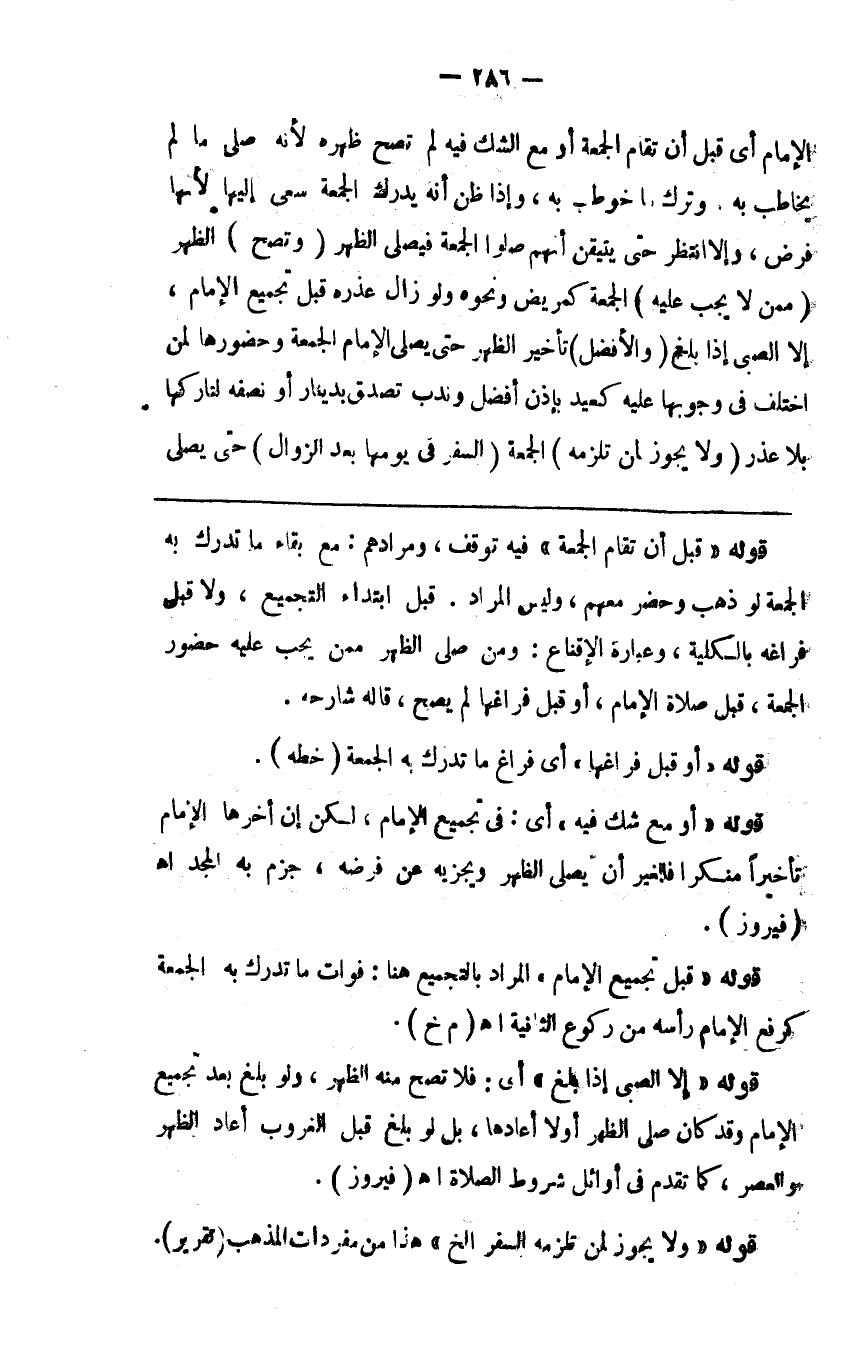 الإمام ) أي قبل أن تقام الجمعة أو مع الشك فيه ( لم تصح ) ظهره لأنه صلى مالم يخاطب به وترك ما خوطب به وإذا ظن أنه يدرك الجمعة سعى إليها لأنها فرضه وإلا انتظر حتى يتيقن أنهم صلوا الجمعة فيصلي الظهر ( وتصح ) الظهر ( ممن لاتجب عليه ) الجمعة لمرض ونحوه فيصلي الظهر ولو زال عذره قبل تجميع الإمام إلا الصبي إذا بلغ ( والأفضل ) تأخير الظهر ( حتى يصلي الإمام ) الجمعة وحضورها لمن اختلف في وجوبها عليه كعبد أفضل وندب تصديق بدينار أو نصفه لتاركها بلا عذر ( ولا يجوز لمن تلزمه ) الجمعة ( السفر في يومها بعد الزوال ) حتى يصلي
