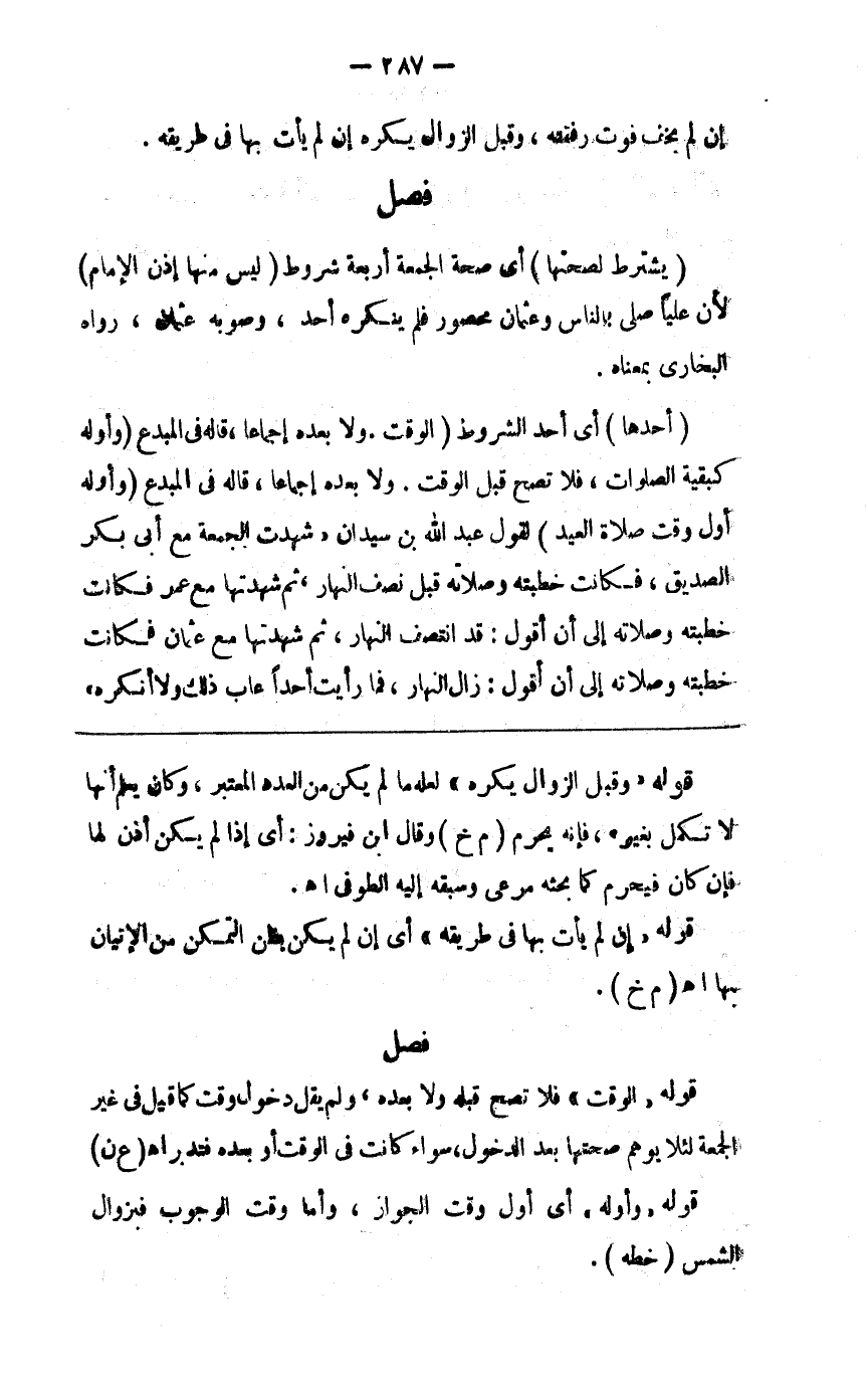 (يشترط لصحتها) أي صحة الجمعة أربعة شروط (ليس منها إذن الإمام) لأن عليا صلى بالناس وعثمان محصور فلم ينكره أحد وصوبه عثمان رواه البخارى بمعناه (أحدها) أي أحد الشروط (الوقت) لأنها صلاة مفروضة فاشترط لها الوقت كبقية الصلوات فلا تصح قبل الوقت ولا بعده إجماعا قاله في المبدع (وأوله أول وقت صلاة العيد) لقول عبد الله بن سيلان شهدت الجمعة مع أبي بكر فكانت خطبته وصلاته قبل نصف النهار ثم شهدتها مع عمر فكانت خطبته وصلاته إلى أن أقول قد انتصف النهار ثم شهدتها مع عثمان فكانت خطبته وصلاته إلى أن أقول قد زال النهار فما رأيت أحدا عاب ذلك ولا أنكره