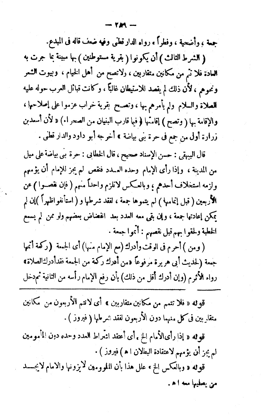 جمعة وأضحى وفطر رواه الدارقطني وفيه ضعف قاله في المبدع ( الشرط الثالث ) أن يكونوا ( بقرية مستوطنين ) بها مبنية بما جرت به العادة فلا تتم من مكانين متقاربين ولا تصح من أهل الخيام وبيوت الشعر ونحوهم لأن ذلك لم يقصد للاستيطان غالبا وكانت قبائل العرب حوله صلى الله عليه وسلم ولم يأمرهم بها وتصح بقرية خراب عزموا على إصلاحها والإقامة بها ( وتصح ) إقامتها ( فيما قارب البنيان من الصحراء ) لأن أسعد بن زرارة أول من جمع في حرة بني بياضة أخرجه أبو داود والدارقطني قال البيهقي حسن الإسناد صحيح قال الخطابي حرة بني بياضة على ميل من المدينة وإذا رأى الإمام وحده العدد فنقص لم يجز أن يؤمهم ولزمه استخلاف أحدهم وبالعكس لاتلزم واحدا منهم ( فإن نقصوا ) عن الأربعين ( قبل إتمامها ) لم يتموها جمعة لفقد شرطها و ( استأنفوا ظهرا ) إن لم تمكن إعادتها جمعة وإن بقي معه العدد بعد انفضاض بعضهم ولو ممن لم يسمع الخطبة ولحقوا بهم قبل نقصهم أتموا جمعة ( ومن ) أحرم في الوقت و ( أدرك مع الإمام منها ) أي من الجمعة ( ركعة أتمها جمعة ) لحديث أبي هريرة مرفوعا من أدرك ركعة من الجمعة فقد أدرك الصلاة رواه الأثرم ( وإن أدرك أقل من ذلك ) بأن رفع الإمام رأسه من الثانية ثم دخل