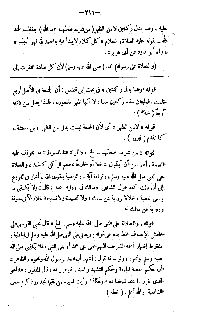 عليه وهما بدل الركعتين لا من الظهر ( ومن شرط صحتهما حمد الله ) بلفظ الحمد لله لقوله صلى الله عليه وسلم كل كلام لا يبدأ فيه بالحمد لله فهو أجدم رواه أبو داود عن أبى هريرة ( والصلاة على رسوله محمد صلى الله عليه وسلم لأن كل عبادة افتقرت إلى