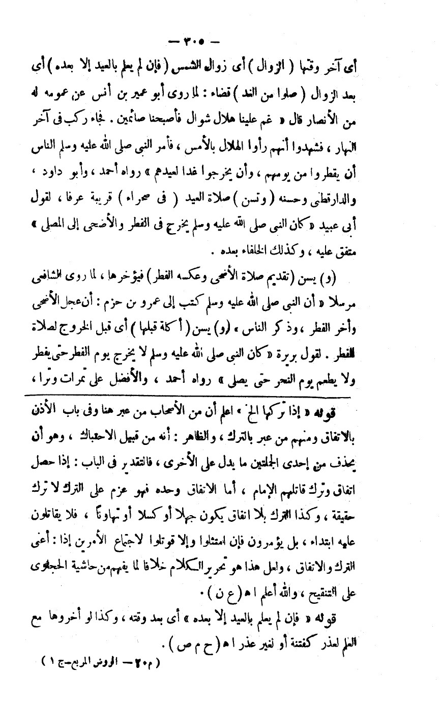 أي آخر وقتها ( الزوال ) أي زوال الشمس ( فإن لم يعلم بالعيد إلا بعده ) أي بعد الزوال ( صلوا من الغد ) قضاء لما روى أبو عمير بن أنس عن عمومة له من الأنصار قال غم علينا هلال شوال فأصبحنا صياما فجاء ركب في آخر النهار فشهدوا أنهم رأوا الهلال بالأمس فأمر النبي صلى الله عليه وسلم الناس أن يفطروا من يومهم وأن يخرجوا غدا لعيدهم رواه أحمد وأبو داود والدارقطني وحسنه مكان الصلاة ( وتسن ) صلاة العيد ( في صحراء ) قريبة عرفا لقول أبي سعيد كان النبي صلى الله عليه وسلم يخرج في الفطر والأضحى إلى المصلى متفق عليه وكذلك الخلفاء بعده ( و ) يسن ) ( تقديم صلاة الأضحى وعكسه الفطر ) فيؤخرها لما روى الشافعي مرسلا أن النبي صلى الله عليه وسلم كتب إلى عمرو بن حزم أن عجل الأضحى وأخر الفطر وذكر الناس ( و ) يسن ( أكله قبلها ) أي قبل الخروج لصلاة الفطر لقول بريرة كان النبي صلى الله عليه وسلم لا يخرج يوم الفطر حتى يفطر ولا يطعم يوم النحر حتى يصلي رواه أحمد وأفضل على تمرات وترا