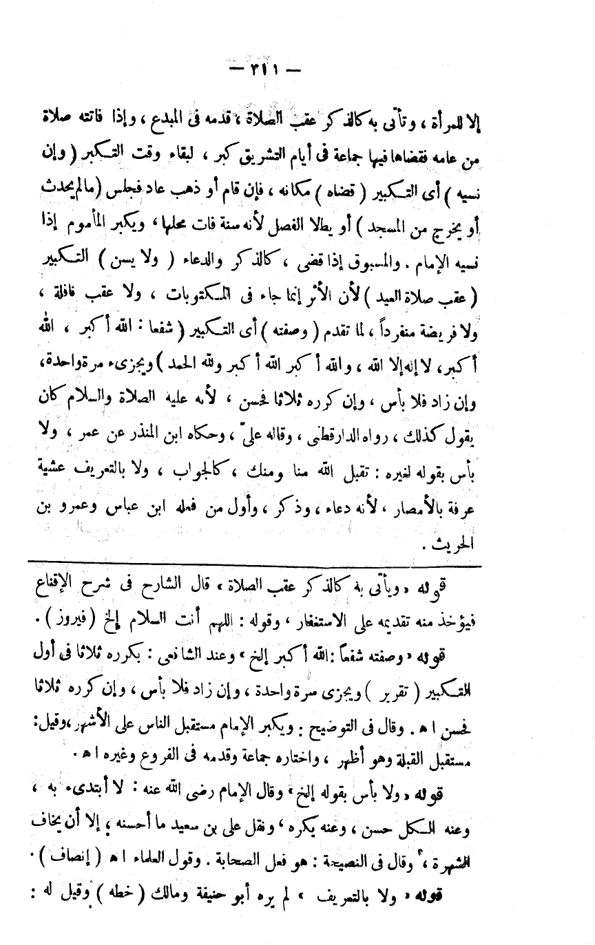 إلا للمرأة وتأتي به كالذكر عقب الصلاة قدمه في المبدع وإذا فاتته صلاة من عامه فقضاها فيها جماعة كبر لبقاء وقت التكبير ( وإن نسيه ) أي التكبير ( قضاه ) مكانه فإن قام أو ذهب عاد فجلس ( مالم يحدث أو يخرج من المسجد ) أو يطل الفصل لأنه سنة فات محلها ويكبر المأموم إذا نسيه الإمام والمسبوق إذا قضى كالذكر والدعاء ( ولا يسن ) التكبير ( عقب صلاة عيد ) لأن الأثر إنما جاء في المكتوبات ولاعقب نافلة ولا فريضة صلاة ا منفردا لما تقدم ( وصفته ) أي التكبير ( شفعا الله أكبر الله أكبر لا إله إلا الله والله أكبر الله أكبر ولله الحمد ) ويجزئ مرة واحدة وإن زاد فلا بأس وإن كرره ثلاثا فحسن لأنه صلى الله عليه وسلم كان يقول كذلك رواه الدارقطني وقاله علي وحكاه ابن المنذر عن عمر ولا بأس بقوله لغيره تقبل الله منا ومنك كالجواب ولا بالتعريف عشية عرفة بالأمصار لأنه دعاء وذكر وأول من فعله ابن عباس وعمرو بن حريث