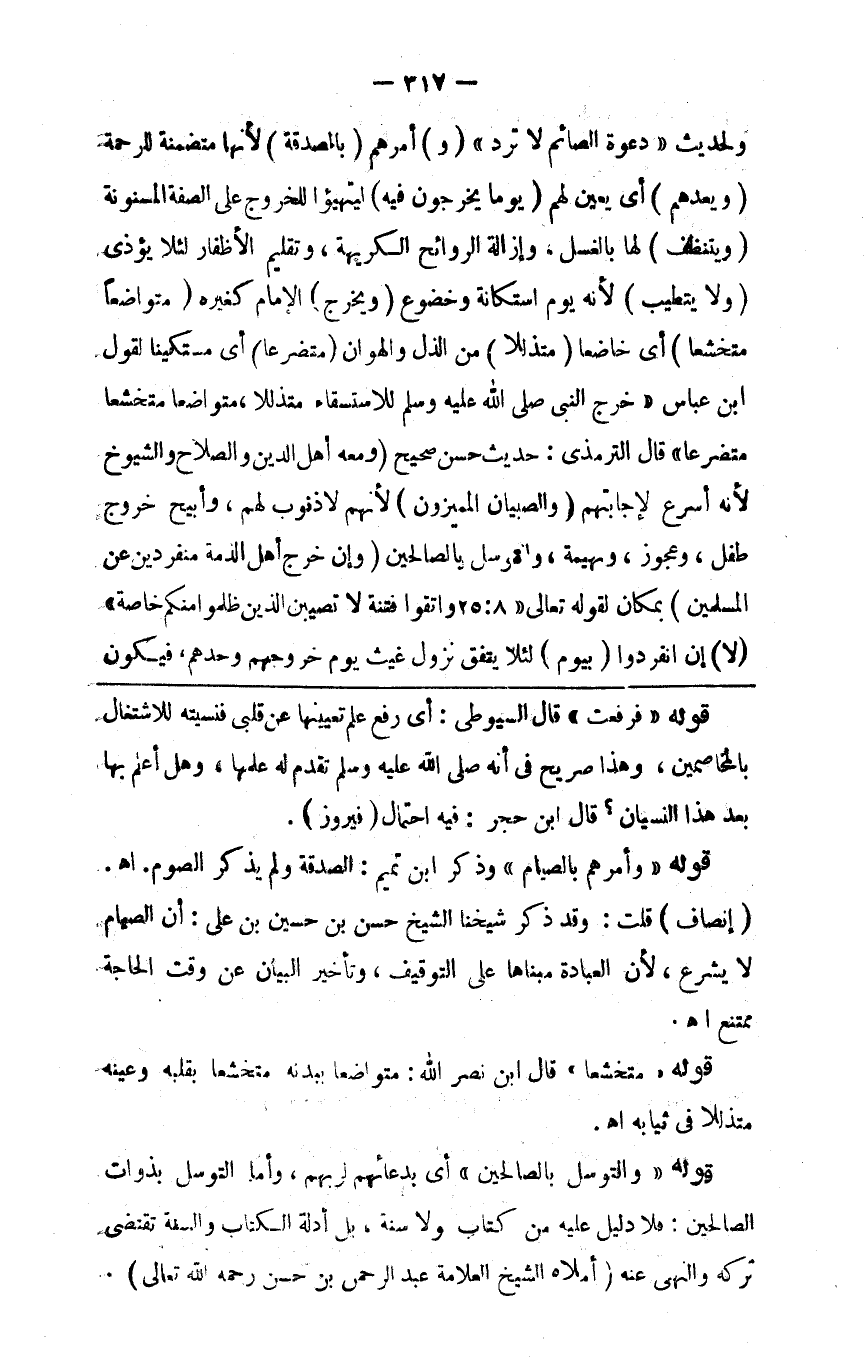 ولحديث دعوة الصائم لا ترد ( و ) أمرهم ( بالصدقة ) لأنها متضمنة للرحمة ( ويعدهم ) أي يعين لهم ( يوما يخرجون فيه ) ليتهيئوا للخروج على الصفة المسنونة ( ويتنظف ) لها بالغسل وإزالة الروائح الكريهة وتقليم الأظفار لئلا يؤذي ( ولا يتطيب ) لأنه يوم استكانة وخضوع ( ويخرج ) الإمام كغيره ( متواضعا متخشعا ) أي خاضعا ( متذللا ) من الذل وهو الهوان ( متضرعا ) أي مستكينا لقول ابن عباس خرج النبي صلى الله عليه وسلم للاستسقاء متذللا متواضعا متخشعا متضرعا قال الترمذي حديث حسن صحيح ( ومعه أهل الدين والصلاح والشيوخ ) لأنه أسرع لإجابتهم ( والصبيان المميزون ) لأنهم لا ذنوب لهم وأبيح خروج طفل وعجوز وبهيمة والتوسل بالصالحين ( وإن خرج أهل الذمة منفردين عن المسلمين ) بمكان لقوله تعالى { واتقوا فتنة لا تصيبن الذين ظلموا منكم خاصة } لا إن انفردوا ( بيوم ) لئلا يتفق نزول غيث يوم خروجهم وحدهم فيكون