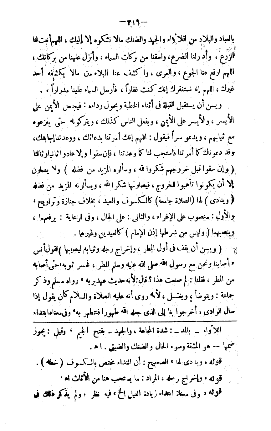 بالعباد والبلاد من اللأواء والجهد والضنك ما لا نشكوه إلا إليك اللهم أنبت لنا الزرع وأدر لنا الضرع واسقنا من بركات السماء وأنزل علينا من بركاتك اللهم ارفع عنا الجوع والجهد والعري واكشف عنا من البلاء ما لا يكشفه أحد غيرك اللهم إنا نستغفرك إنك كنت غفارا فأرسل السماء علينا مدرارا ويسن أن يستقبل القبلة في أثناء الخطبة ويحول رداءه فيجعل الأيمن على الأيسر والأيسر على الأيمن ويفعل الناس كذلك ويتركونه حتى ينزعوه مع ثيابهم ويدعو سرا فيقول اللهم إنك أمرتنا بدعائك ووعدتنا إجابتك وقد دعوناك كما أمرتنا فاستجب لنا كما وعدتنا فإن سقوا وإلا عادوا ثانيا وثالثا ( وإن سقوا قبل خروجهم شكروا الله وسألوه المزيد من فضله ) ولا يصلون إلا أن يكونوا تأهبوا للخروج فيصلونها شكرا لله ويسألونه المزيد من فضله ( وينادي ) لها ( الصلاة جامعة ) كالكسوف والعيد بخلاف جنازة وتراويح والأول منصوب على الإغراء والثاني على الحال وفي الرعاية يرفعهما وينصبهما ( وليس من شروطها إذن الإمام ) كالعيدين وغيرهما ( ويسن أن يقف في أول المطر وإخراج رحله وثيابه ليصيبها ) لقول أنس أصابنا ونحن مع رسول الله صلى الله عليه وسلم مطر فحسر ثوبه حتى أصابه من المطر فقلنا لم صنعت هذا قال لأنه حديث عهد بربه رواه مسلم وذكر جماعة ويتوضأ ويغتسل لأنه روي أنه صلى الله عليه وسلم كان يقول إذا سال الوادي اخرجوا بنا إلى الذي جعله الله طهورا فنتطهر به وفي معناه ابتداء