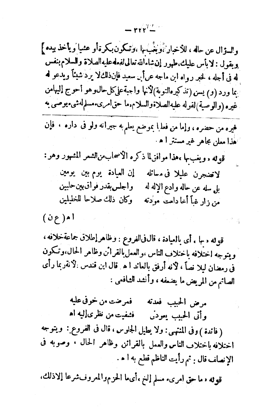 والسؤال عن حاله للأخبار ويغب بها وتكون بكرة أو عشيا ويأخذ بيده ويقول لا بأس طهورا إن شاء الله تعالى لفعله صلى الله عليه وسلم وينفس له في أجله لخبر رواه ابن ماجه عن أبي سعيد فإن ذلك لايرد شيئا ويدعو له بما ورد ( و ) يسن ( تذكيره التوبة ) لأنها واجبة على كل حال وهو أحوج إليها من غيره ( والوصية ) لقوله صلى الله عليه وسلم ما حق امرئ مسلم له شيء يوصي به