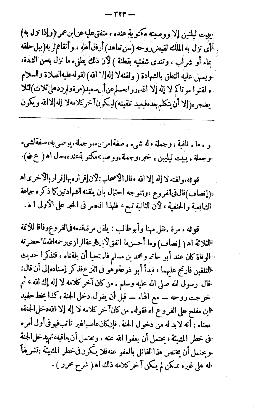 يبيت ليلتين إلا ووصيته مكتوبة عنده متفق عليه عن ابن عمر ( وإذا نزل له ) أي نزل به الملك لقبض روحه ( سن تعاهد ) أرفق أهله وأتقاهم لربه ( ببل حلقه بماء أو شراب وتندى شفتيه ) بقطنة ( لأن ذلك يطفئ ما نزل به من الشدة وتسهل عليه النطق بالشهادة ) ( وتلقينه لا إله إلا الله ) لقوله صلى الله عليه وسلم لقنوا موتاكم لا إله إلا الله رواه مسلم عن أبي سعيد ( مرة ولم يزد على ثلاث ) لئلا يضجره ( إلا أن يتكلم بعده فيعيد تلقينه ) إلى ثلاث ليكون آخر كلامه لا إله إلا الله ويكون