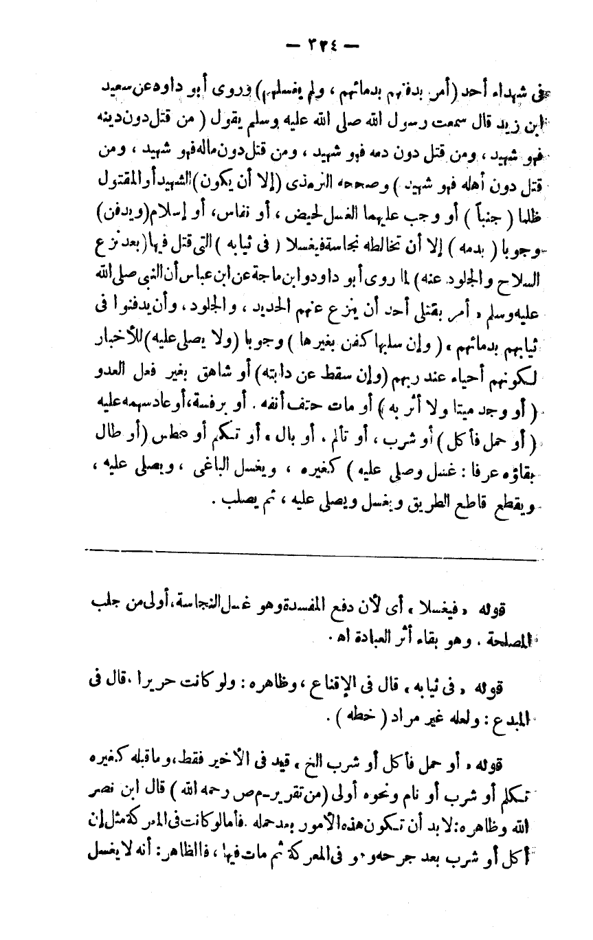 في شهداء أحد أمر بدفنهم بدمائهم ولم يغسلهم وروى أبو داود عن سعيد بن زيد قال سمعت رسول الله صلى الله عليه وسلم يقول من قتل دون دينه فهو شهيد ومن قتل دون دمه فهو شهيد ومن قتل دون ماله فهو شهيد ومن قتل دون أهله فهو شهيد وصححه الترمذي ( إلا أن يكون ) الشهيد أو المقتول ظلما ( جنبا ) أو وجب عليهما الغسل لحيض أو نفاس أو إسلام ( ويدفن ) وجوبا ( بدمه ) إلا أن تخالطه نجاسة فيغسلا و ( في ثيابه ) التي قتل فيها ( بعد نزع السلاح والجلود عنه ) لما روى أبو داود وابن ماجه عن ابن عباس أن النبي صلى الله عليه وسلم أمر بقتلى أحد أن ينزع عنهم الحديد والجلود وأن يدفنوا في ثيابهم بدمائهم ( وإن سلبها كفن بغيرها وجوبا ( ولا يصلى عليهم ) للأخبار لكونهم أحياء عند ربهم ( وإن سقط عن دابته ) أو شاهق بغير فعل العدو ( أو وجد ميتا ولا أثر به ) أو مات حتف أنفه أو برفسة أو عاد سهمه عليه ( أو حمل فأكل ) أو شرب أو نام أو بال أو تكلم أو عطس ( أو طال بقاؤه عرفا غسل وصلي عليه ) كغيره ويغسل الباغي ويصلى عليه ويقتل قاطع الطريق ويغسل ويصلى عليه ثم يصلب