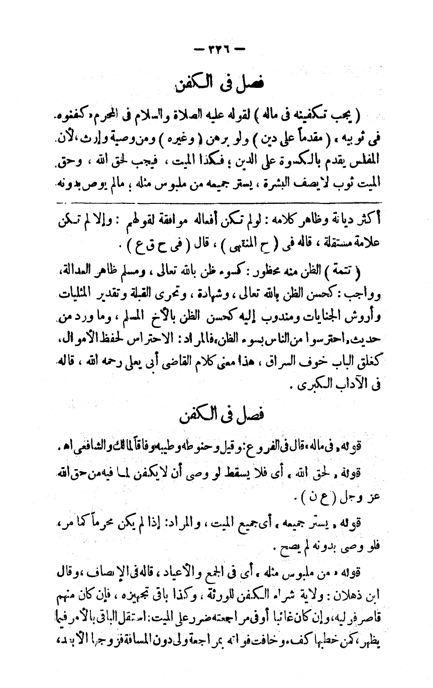 (ويجب تكفينه في ماله) لقوله صلى الله عليه وسلم في المحرم كفنوه في ثوبيه (مقدما على دين) ولو برهن (وغيره) من وصية وإرث لأن المفلس يقدم بالكسوة على الدين فكذا الميت فيجب لحق الله وحق الميت ثوب لا يصف البشرة يستر جميعه من ملبوس مثله ما لم يوص بدونه