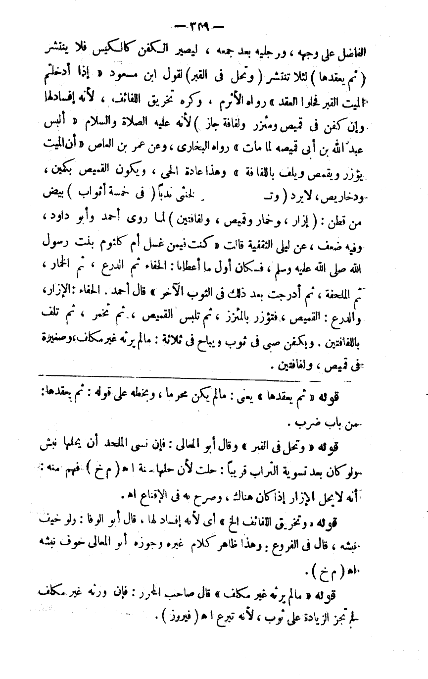 الفاضل على وجهه ورجليه بعد جمعه ليصير الكفن كالكيس فلا ينتشر ( ثم يعقدها ) لئلا تنتشر ( وتحل في القبر ) لقول ابن مسعود إذا أدخلتم الميت القبر فحلوا العقد رواه الأثرم وكره تخريق اللفائف لأنه إفساد لها ( وإن كفن في قميص ومئزر ولفافة جاز ) لأنه صلى الله عليه وسلم ألبس عبد الله بن أبي قميصه لما مات رواه البخارى وعن عمرو بن العاص أن الميت يؤزر ويقمص ويلف باللفافة وهذه عادة الحي ويكون القميص بكمين ودخاريص لا بزر ( وتكفن المرأة ) والخنثى ندبا ( في خمسة أثواب ) بيض من قطن ( إزار وخمار وقميص ولفافتين ) لما روى أحمد وأبو داود وفيه ضعف عن ليلى الثقفية قالت كنت فيمن غسل أم كلثوم بنت رسول الله صلى الله عليه وسلم فكان أول ما أعطانا الحقاء ثم الدرع ثم الخمار ثم الملحفة ثم أدرجت بعد ذلك في الثوب الآخر قال أحمد الحقاء الازار والدرع القميص فتؤزر بالمئزر ثم تلبس القميص ثم تخمر ثم تلف بالفافتين ويكفن صبي في ثوب ويباح في ثلاثة ما لم يرثه غير مكلف وصغيرة في قميص ولفافتين